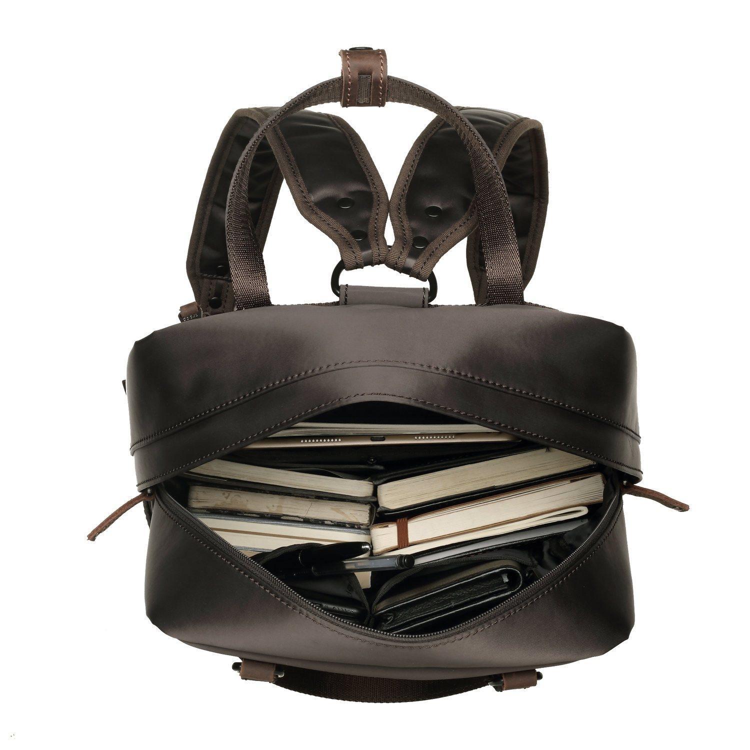 Heritage Nylon Backpack trims with full-grain leather, feature with heavy-duty webbing strap buckle closure. Multiple storage compartments to fits your travel essential, perfect for daily use and it's lightweight to carry.