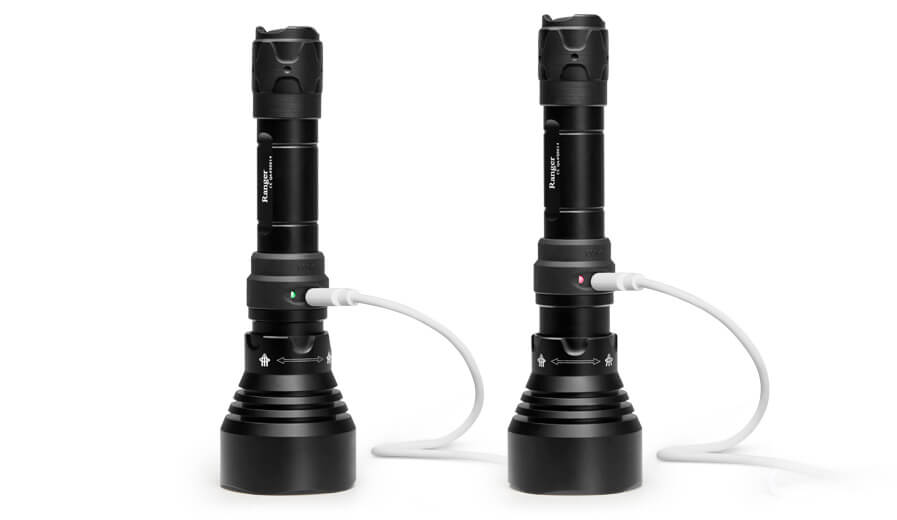 The Wolf Eyes Ranger 56 Ultra is a tactical and hunting torch equipped with an aspherical lens and able to allow the user to switch from a fully flood beam to a fully spot beam. The flood type beam is wide and bright and allows you to illuminate everything in front of you in short distances, the spot beam, on the other hand, is very focused and allows you to illuminate over long distances. The flashlight is equipped with a latest generation 20 W LED Luminus SFT-40-W capable of producing a maximum beam of 1620 lumens. The maximum distance reached thanks to the 56 mm spherical lens and the powerful LED with which this torch is equipped is 645 m. Laterally, near the head, this flashlight has a micro USB charging interface that allows you to charge the cell inside the flashlight without having to remove it. There is also an LED indicator that lights up green when charging is complete and red during the battery recharging phase. The charging port is well protected by the rotating rubber ring which prevents water and dirt from getting inside. Switching from narrow to wide beam is done simply by turning the torch head: Turn the head clockwise to increase the beam angle while turning it in the opposite direction to decrease the beam angle.