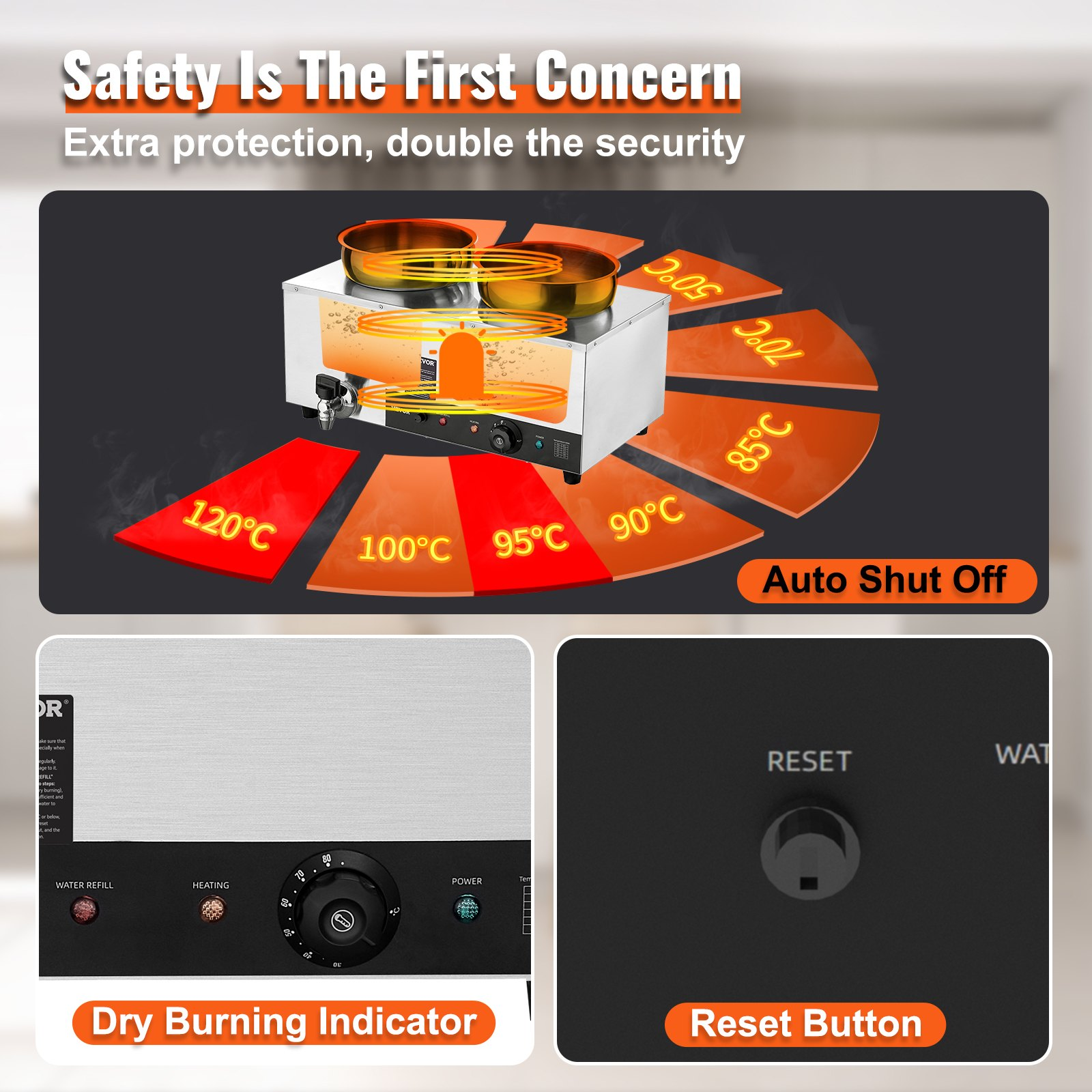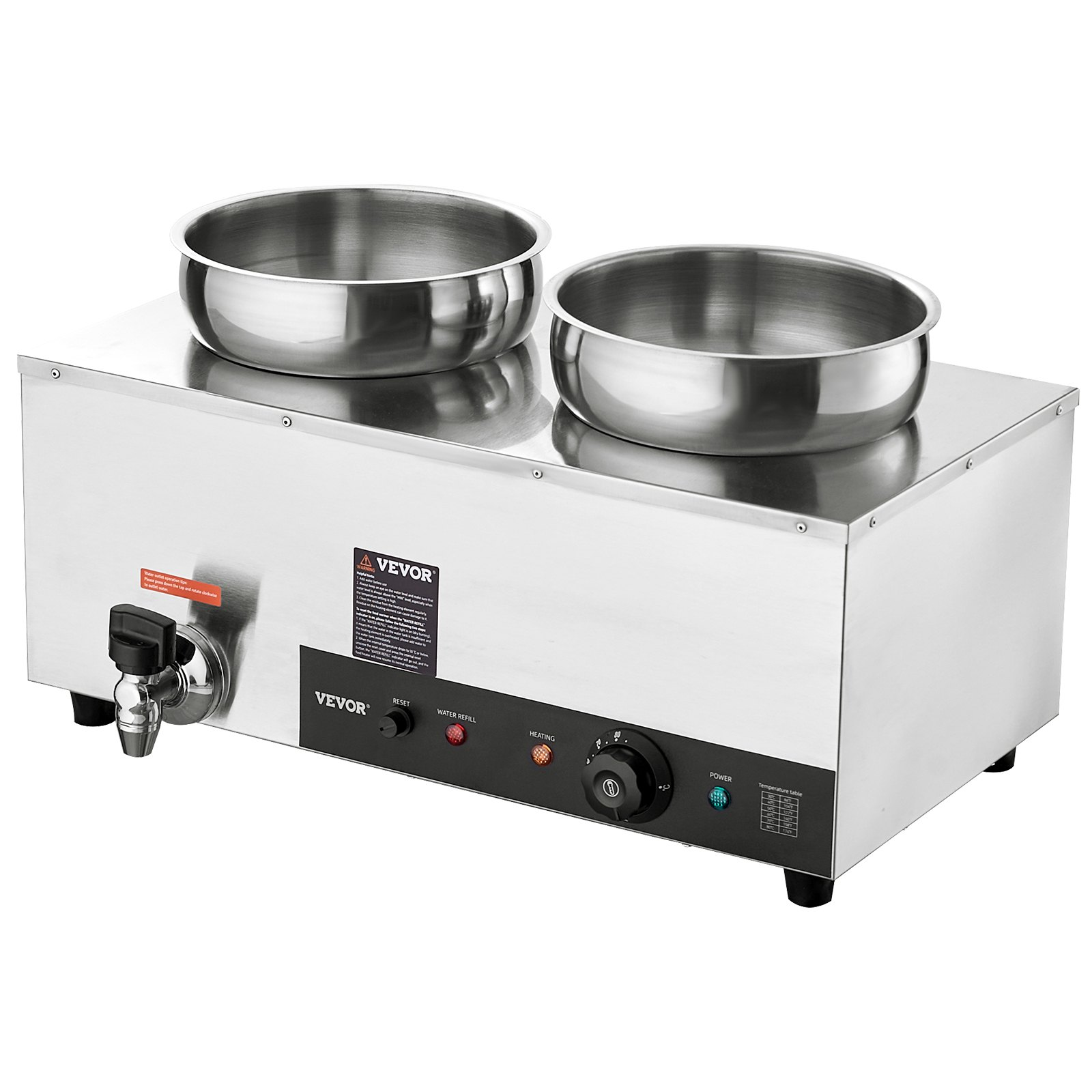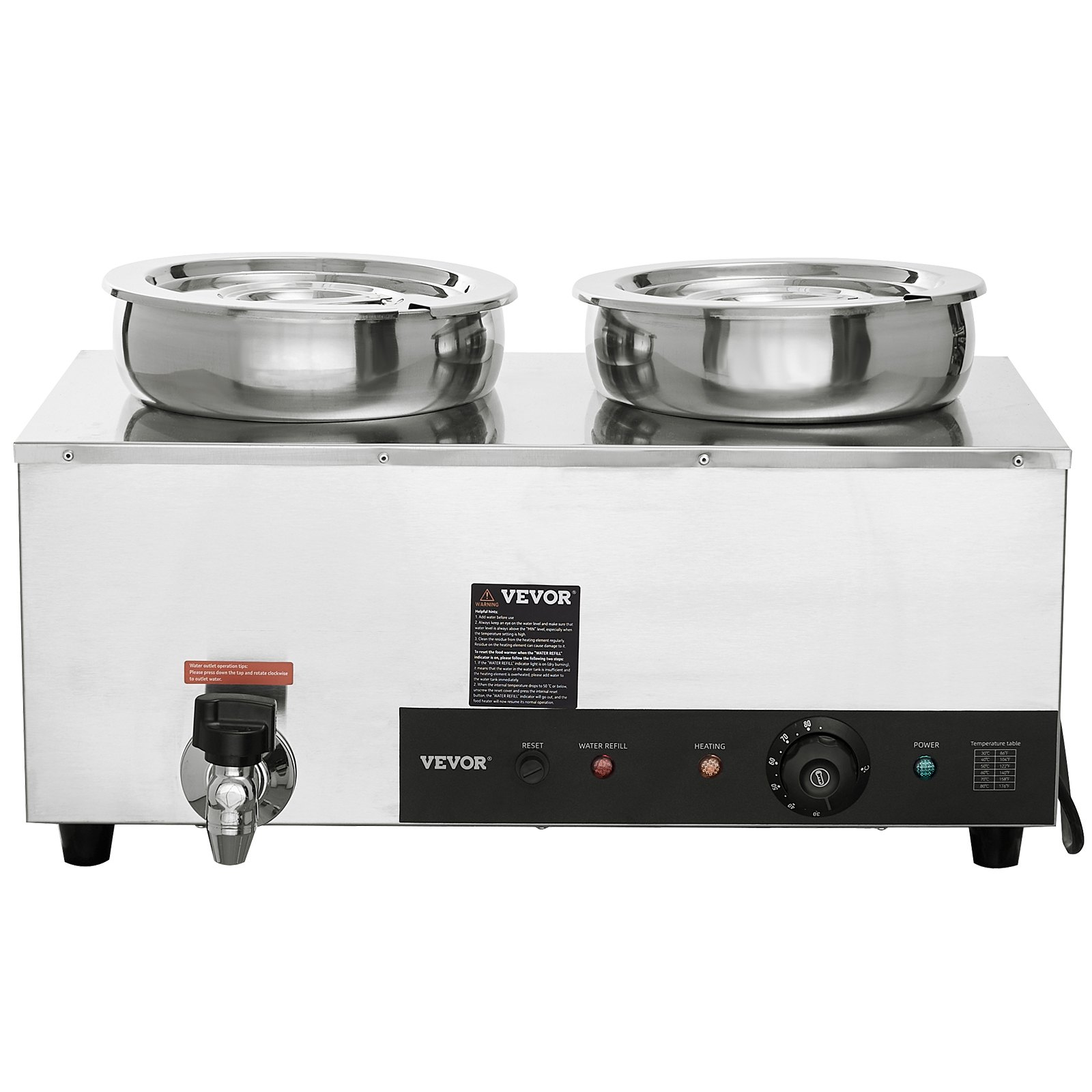 PRODUCT DESCRIPTION VEVOR Electric Soup Warmer, Dual 7.4QT Stainless Steel Round Pot 86~185°F Adjustable Temp, 1200W Commercial Bain Marie with Anti-dry Burn and Reset Button, Soup Station for Restaurant, Buffet, Silver