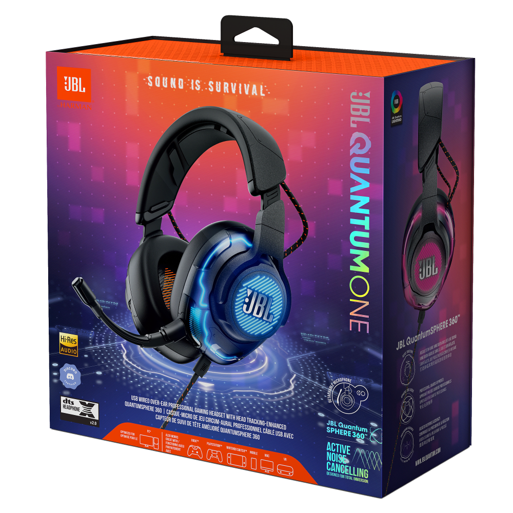 Make your game epic. The JBL Quantum ONE wired headset gives you pro-level audio with head-tracking enhanced JBL QuantumSPHERE 360 spatial surround sound and Active Noise Cancelling tuned for gaming. Designed for precise audio positioning, JBL QuantumSOUND Signature delivers an immersive sound curve