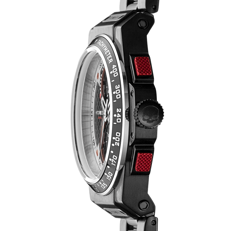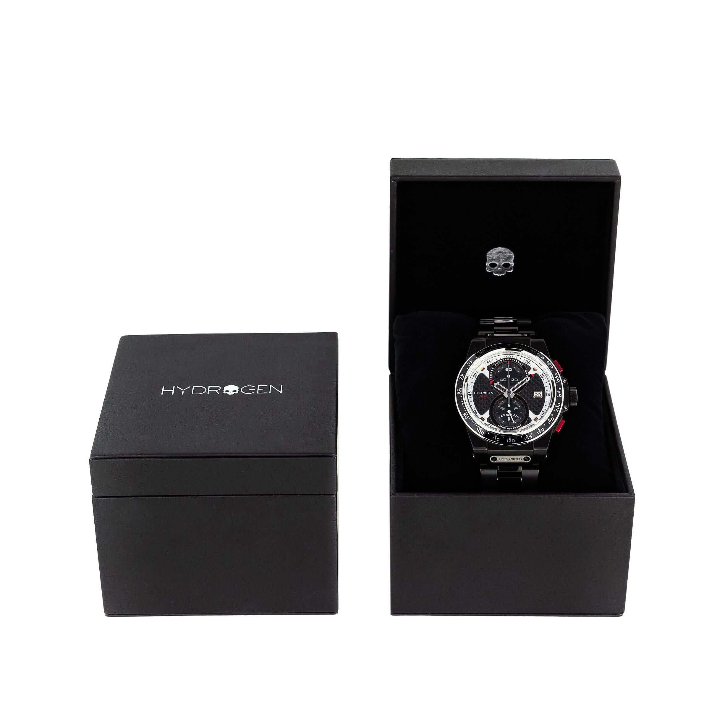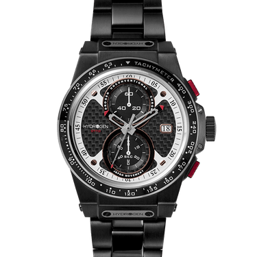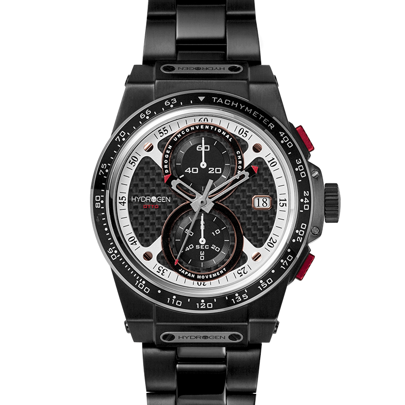 Black authentic carbon fiber dial with chronograph and Tachymeter function are the signatures of this Otto Chrono timepiece. The 44mm case is fabricated in solid SS with a custom 3-link solid SS bracelet and the Racing Red pushers underline the performance of this Hydrogen Watch.