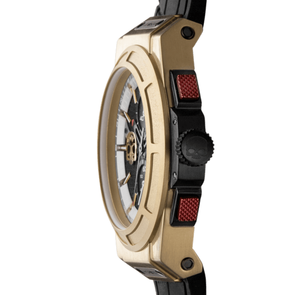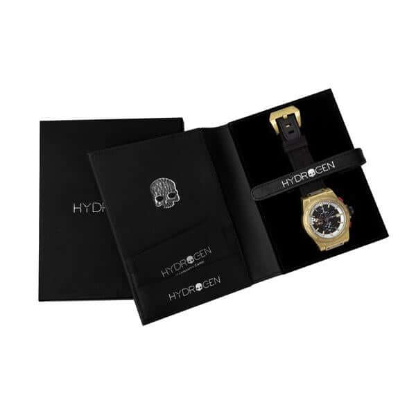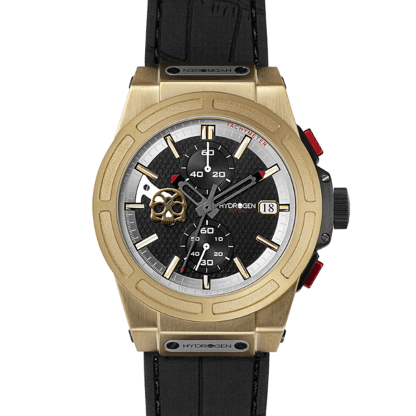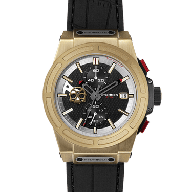 Detailing of an authentic carbon fiber pattern black dial with an enlarged version of the iconic skull Hydrogen logo is featured in Otto Chrono. The 44mm case is fabricated in solid stainless steel and plated in yellow gold, with a faux croco stamped pattern in black silicone. A Men's Watch for individuals.