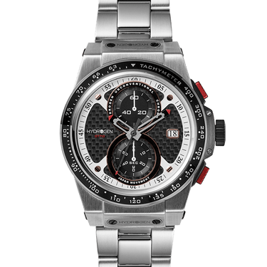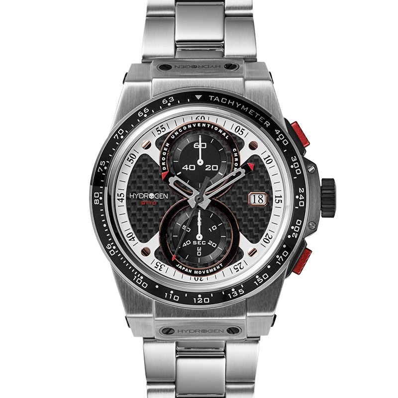 This Otto Chrono model is a bold statement and comes with a 44mm solid stainless steel case in Silver and 3-link bracelet. A black carbon fiber dial, chronograph and date complication makes this Hydrogen timepiece dangerously close to perfection.