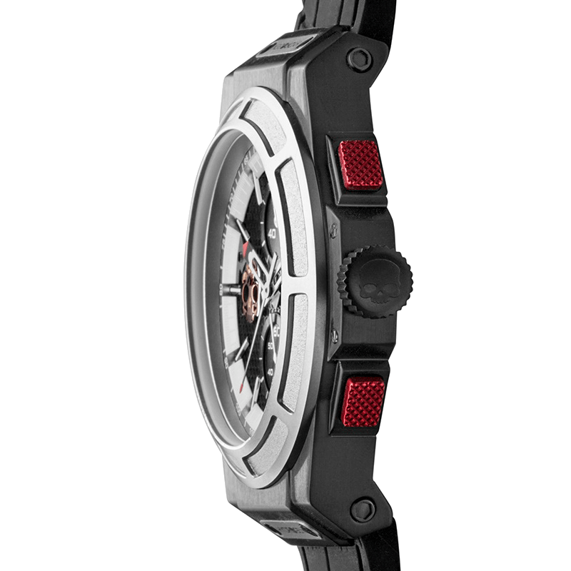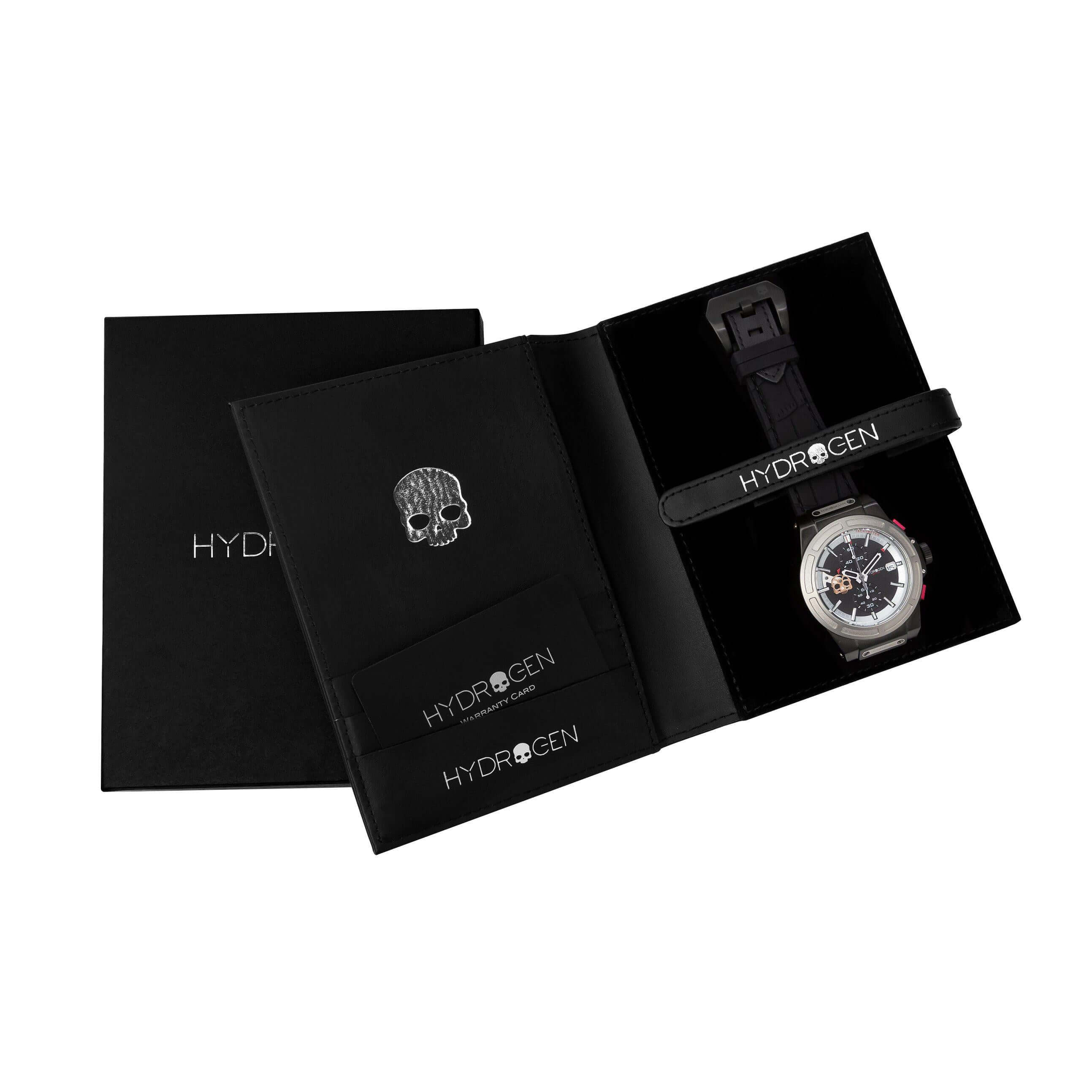 This Otto Chrono Watch represents true “sportswear luxury”. A 44mm SS case plated in ionic black with a Silver Matt bezel and a black carbon fiber dial, differentiate your wrist from others. Chronograph and date complication adds the superior componentry offered in this Hydrogen Watch.