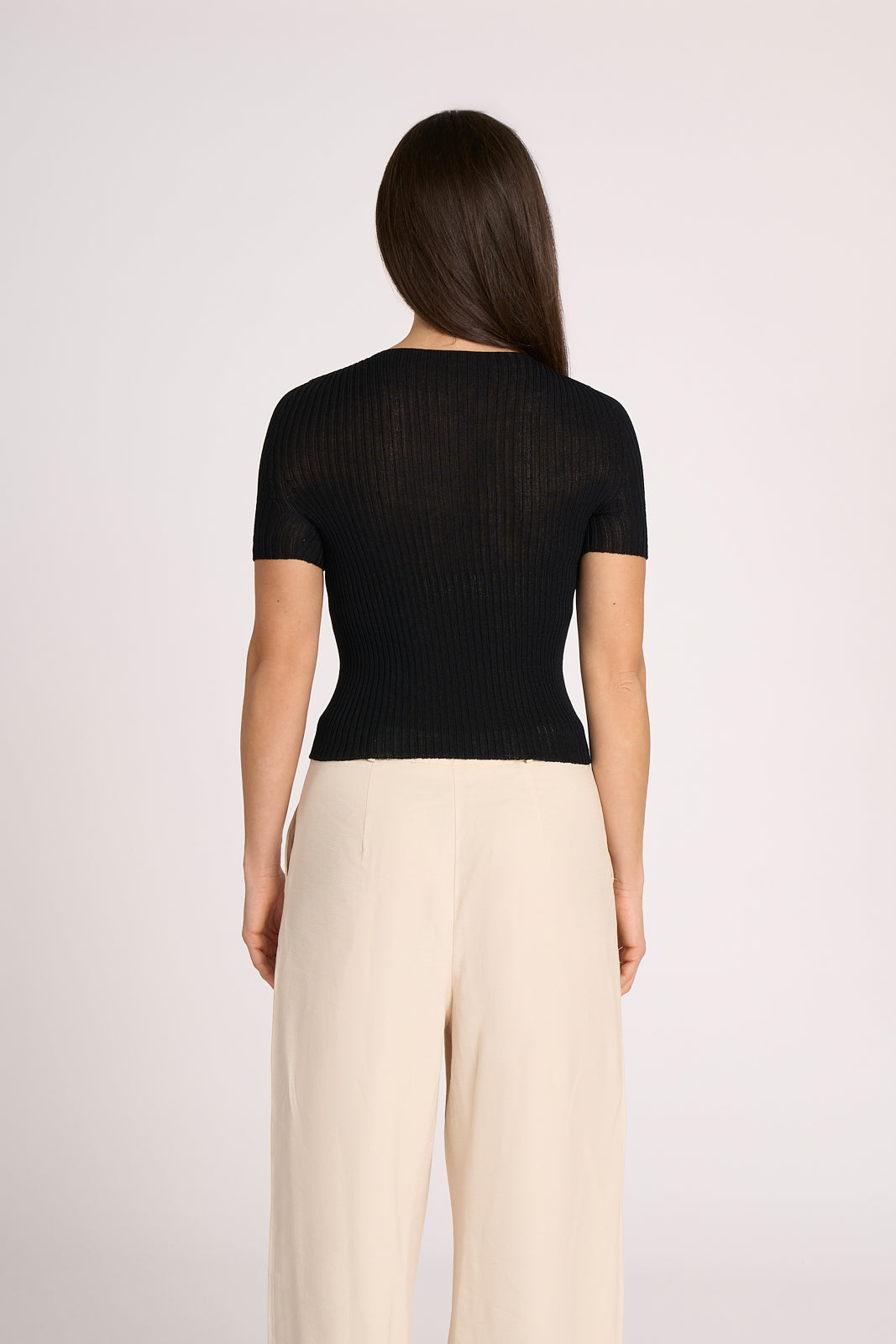 Super thin ribbed short-sleeved T-shirt in recycled viscose, entirely made without seams.