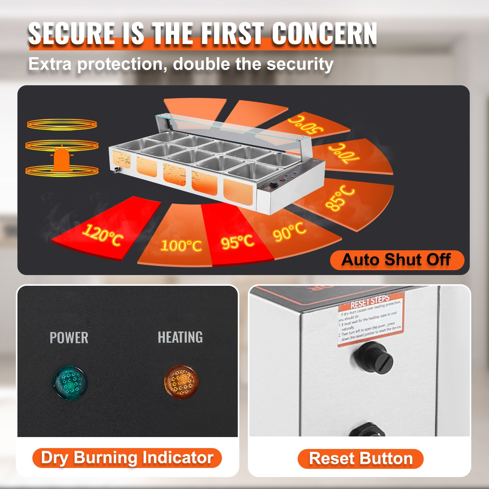 VEVOR Commercial Electric Food Warmer Countertop Buffet 8*8Qt with Glass Shield
