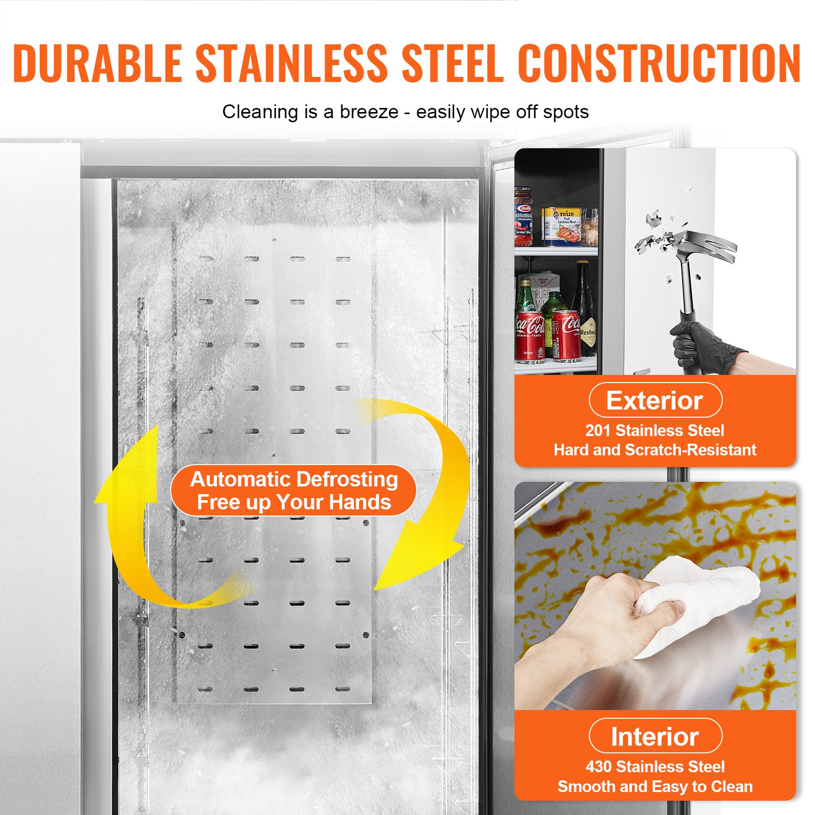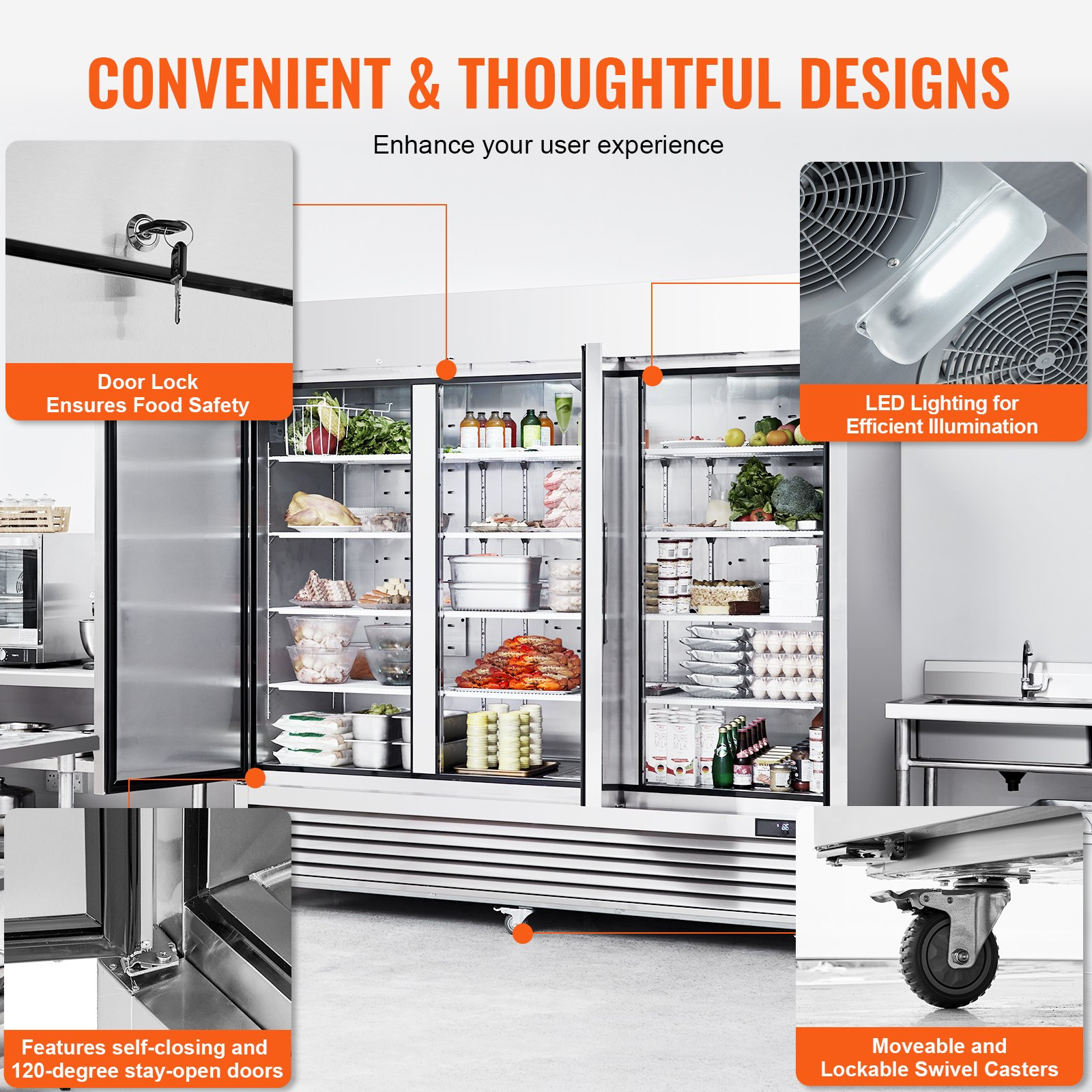 PRODUCT DESCRIPTION VEVOR Commercial Refrigerator 60.42 Cu.ft, Reach In 82.5" W Upright Refrigerator 3 Doors, Auto-Defrost Stainless Steel Reach-in Refrigerator & 12 Shelves, 33 to 41? Temp Control, LED Light, 4 Wheels