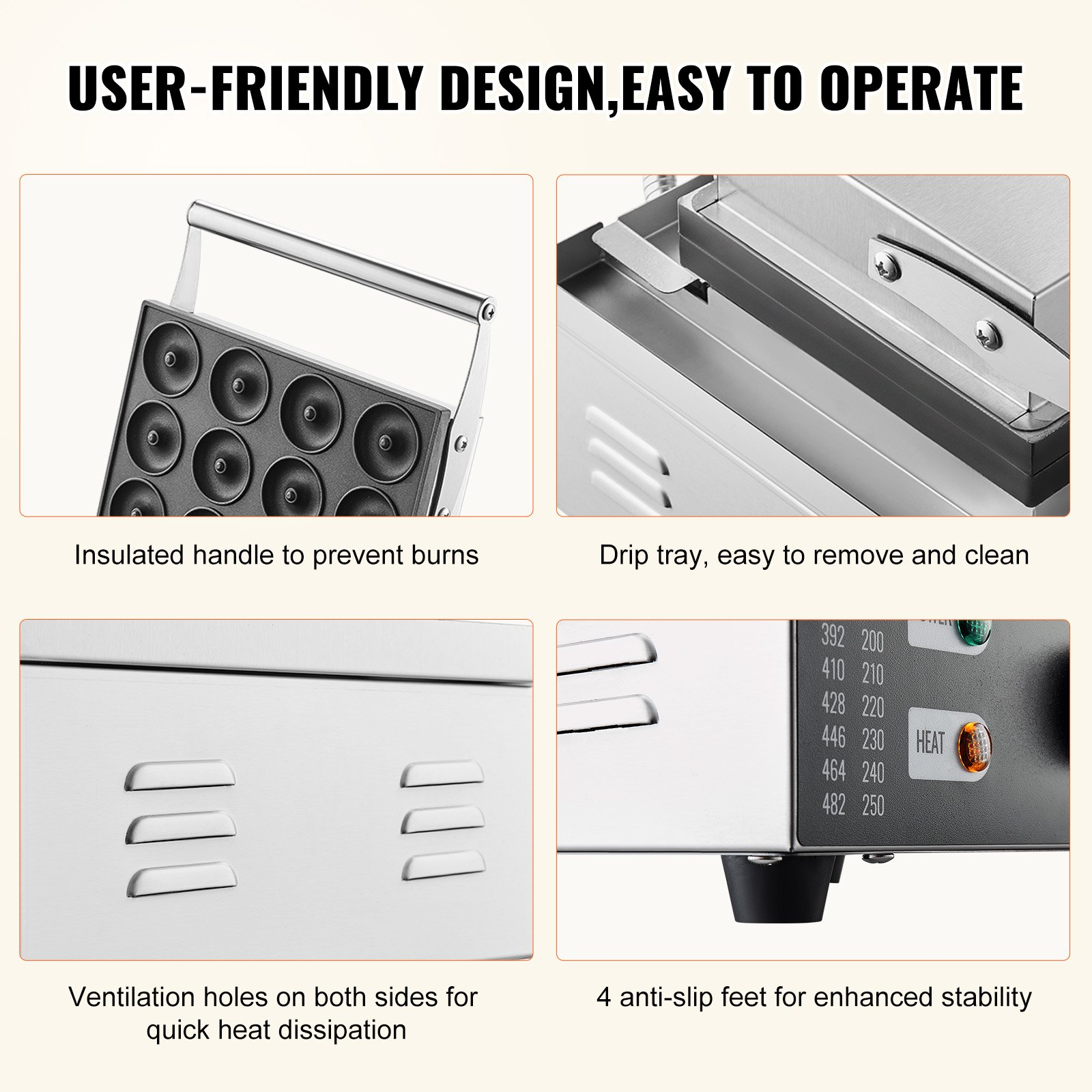 PRODUCT DESCRIPTION VEVOR Electric Donut Maker, 1550W Commercial Doughnut Machine with Non-stick Surface, 12 Hole Double-Sided Heating Waffle Machine Makes 12 Doughnuts, Temperature 122-572?, for Restaurant & Home Use