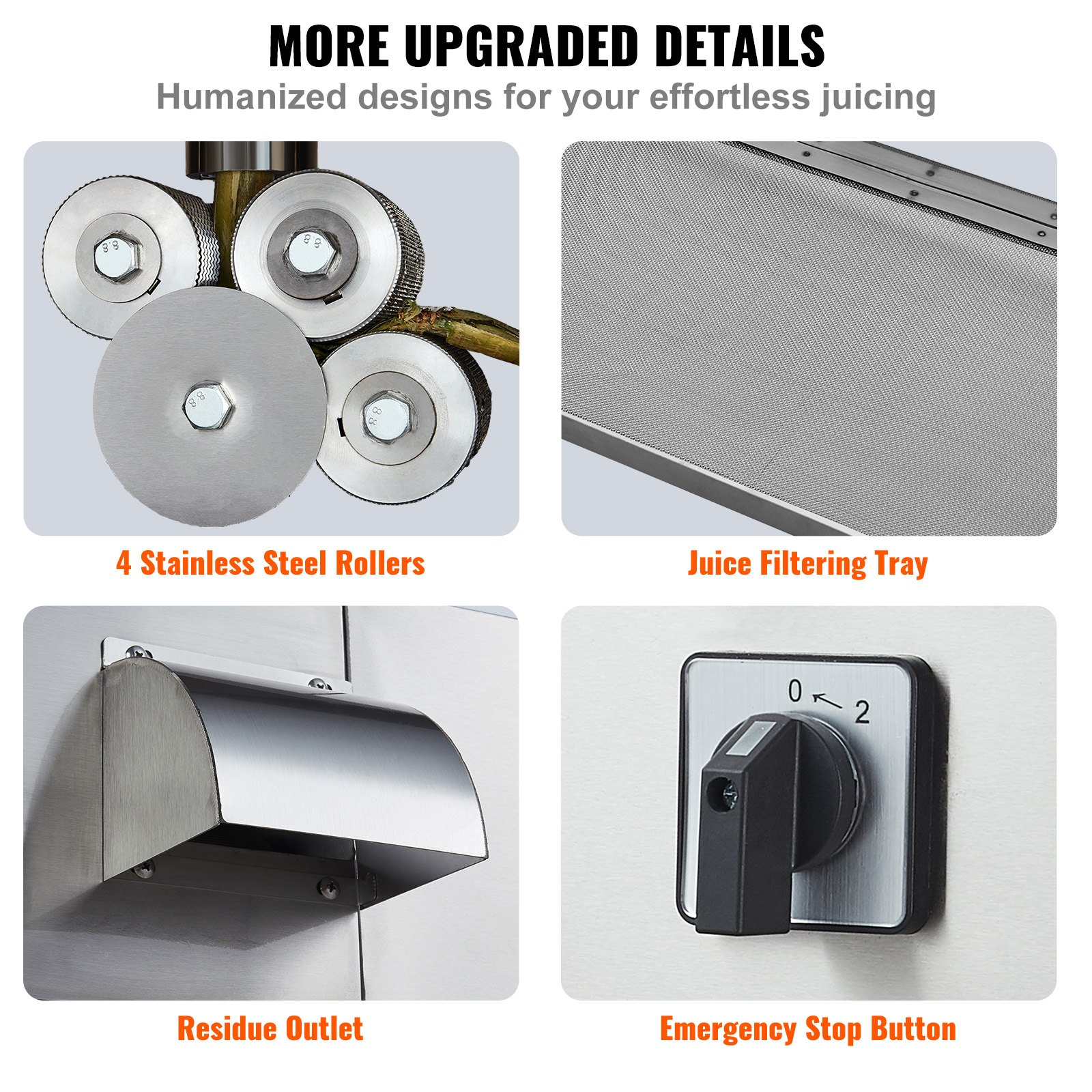 PRODUCT DESCRIPTION VEVOR Electric Sugar Cane Juicer, 800W Sugarcane Juicer Machine with 661LBS/H High Output, 4 Stainless Steel Roller, Auto Roller Pressure Adjustment Sugarcane Juice Press Extractor for Home/Commercial
