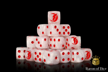 These dice contain crystallized whites swirled with marble hues creating a pearlescent white and inlaid with a valiant red; resin 16mm dice. The symbols are on the 6 side. These dice come in round corner and square corner; choose wisely! Our premium dice now come in unique reusable tins.