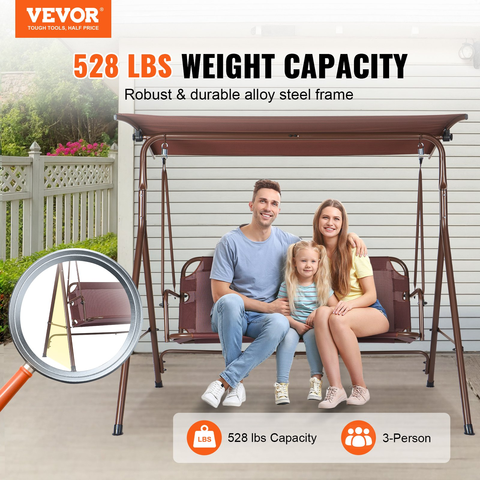 (FINAL PRICES ARE LOWER ON OUR SITE!) VEVOR 3-Person Patio Swing Chair, Outdoor Patio Swing with Adjustable Canopy, Porch Swing with Armrests, Teslin Fabric and Alloy Steel Frame, for Balcony, Backyard, Patio, Garden, Poolside, Brown