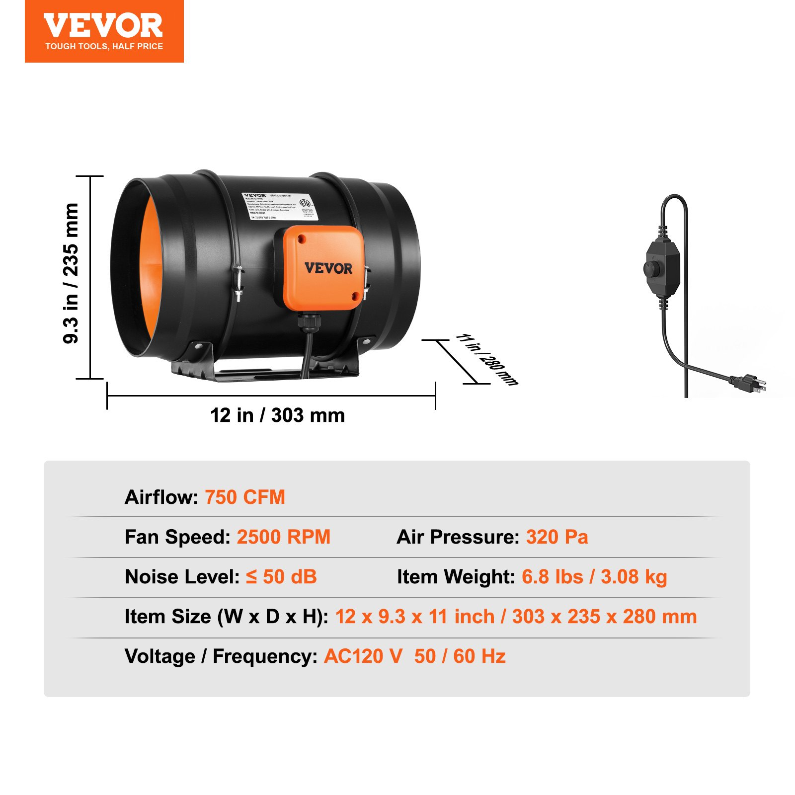 Airflow: 750 CFM,Noise Level: ? 50 dB (About 38 dB),Item Size (L x W x H): 12 x 9.3 x 11 in / 303 x 235 x 280 mm,Motor Type: Copper Motor,Model: VV-GDFJ-AC8,Air Pressure: 320 Pa,Rated Power: 126 W,Fan Speed: 2500 RPM,Item Weight: 6.8 lbs / 3.08 kg,Voltage / Frequency: AC 110V-240V, 50/60Hz