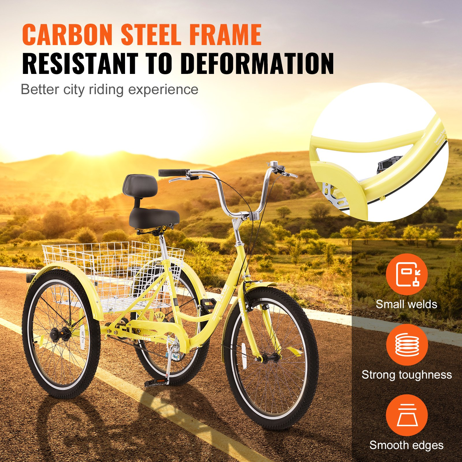 PRODUCT DESCRIPTION VEVOR Adult Tricycles Bike, 20 Inch Three-Wheeled Bicycles, 3 Wheel Bikes Trikes, Carbon Steel Cruiser Bike with Basket & Adjustable Seat, Picnic Shopping Tricycles for Seniors, Women, Men (Yellow)