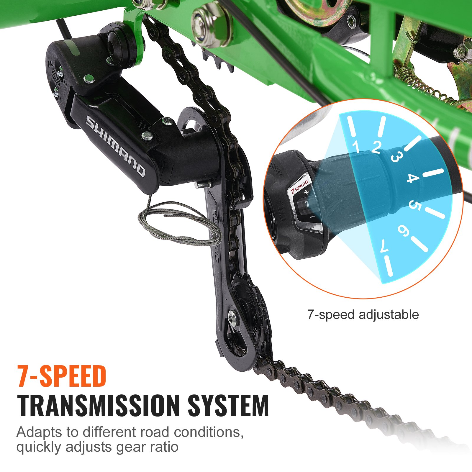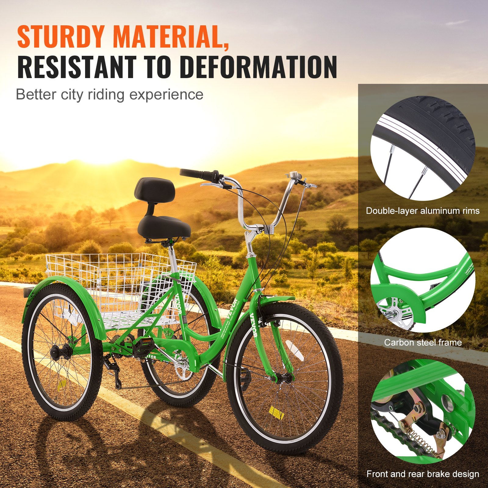 PRODUCT DESCRIPTION VEVOR Adult Tricycles Bike, 7 Speed Adult Trikes, 26 Inch Three-Wheeled Bicycles, Carbon Steel Cruiser Bike with Basket and Adjustable Seat, Picnic Shopping Tricycles for Seniors, Women, Men (Green)