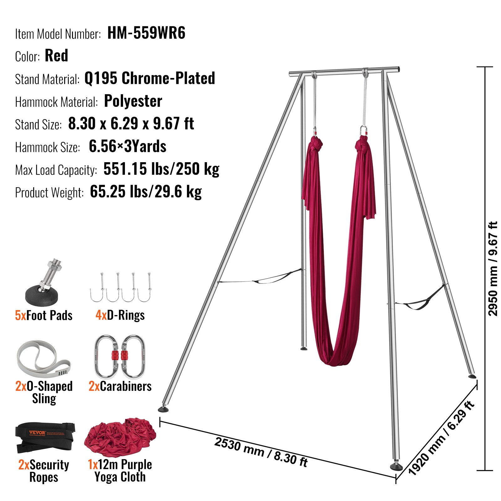 PRODUCT DESCRIPTION VEVOR Aerial Yoga Frame & Yoga Hammock, 9.67 ft Height Professional Yoga Swing Stand Comes with 6.6 Yards Aerial Hammock, Max 551.15 lbs Load Capacity, Yoga Rig for Indoor Outdoor Aerial Yoga, Red
