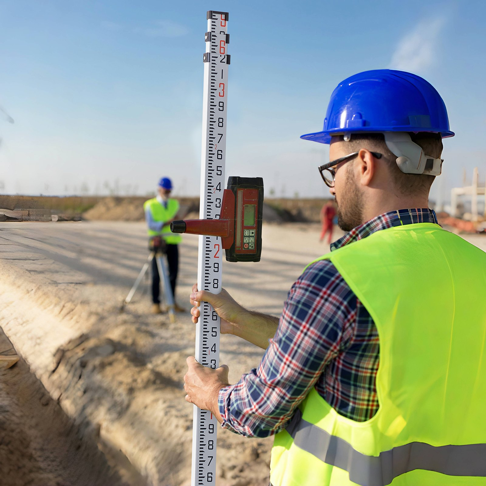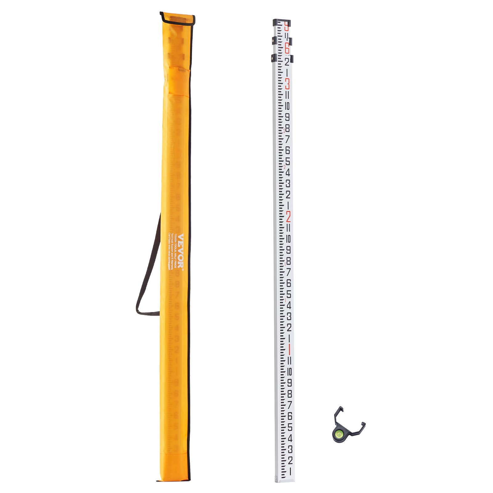 PRODUCT DESCRIPTION VEVOR Aluminum Grade Rod, 9-Feet/8ths 3 Sections Telescopic Measuring Rod, Double-Sided Scale 1/8in Leveling Rod Stick,Aluminum Alloy Survey Rod with Bubble Level &Carrying Bag for Houses,Walls,Floors