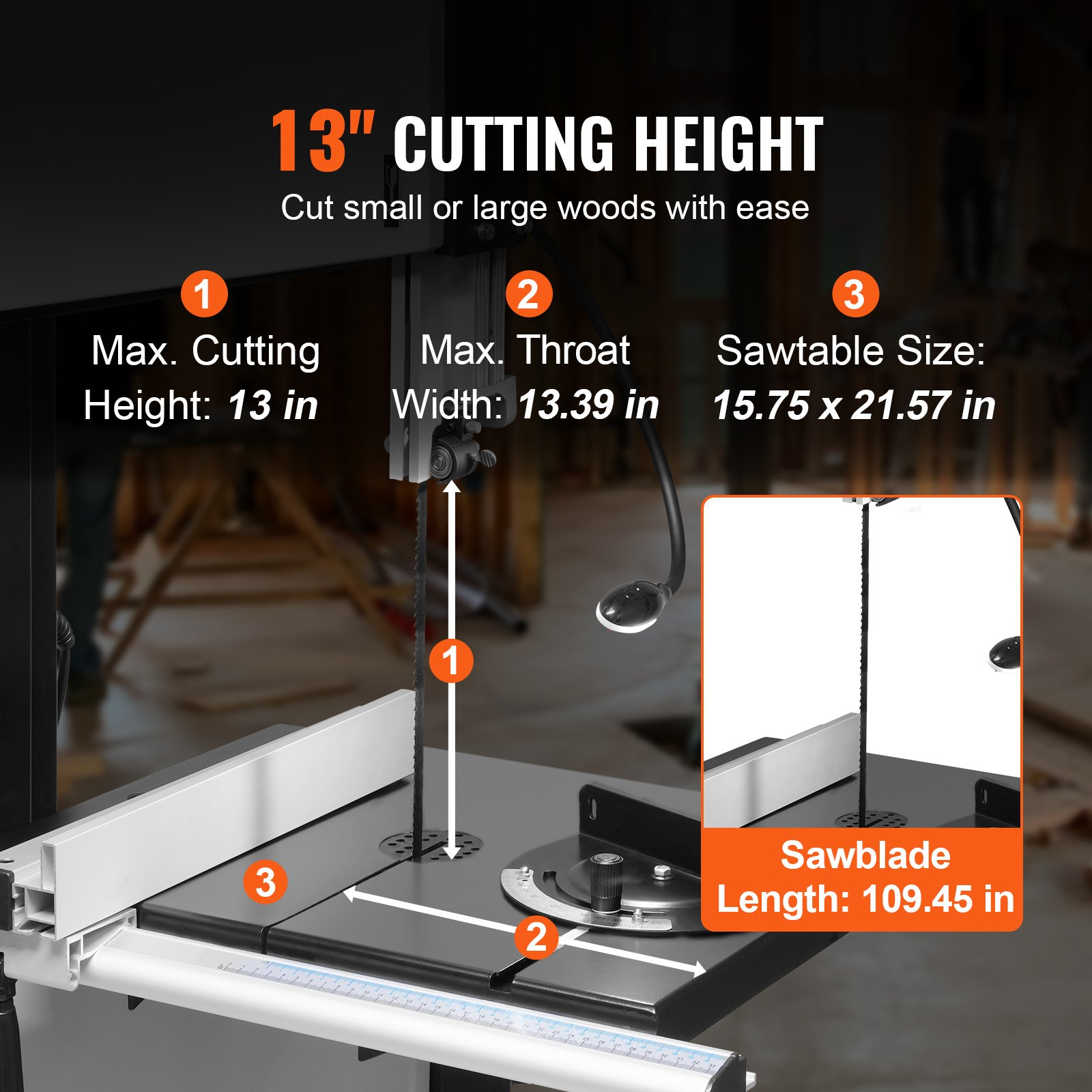 PRODUCT DESCRIPTION VEVOR Band Saw, 14-Inch, 480-960 RPM Continuously Viable Benchtop Bandsaw, 1100W 1-1/2HP Motor, with Optimized Work Light Workbench Stand Cabinet Assembly and Miter Gauge, for Woodworking Aluminum