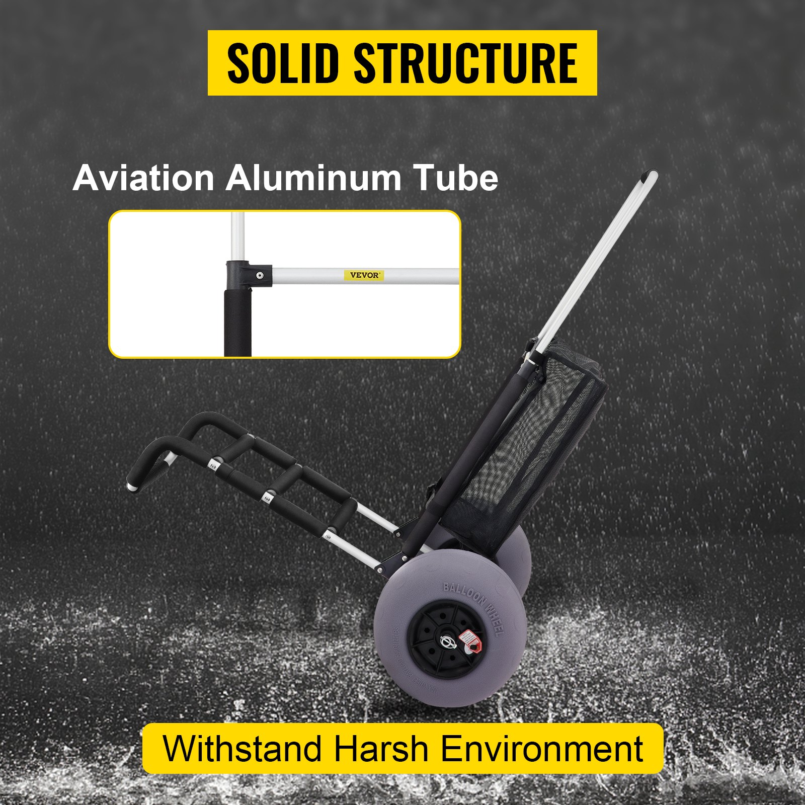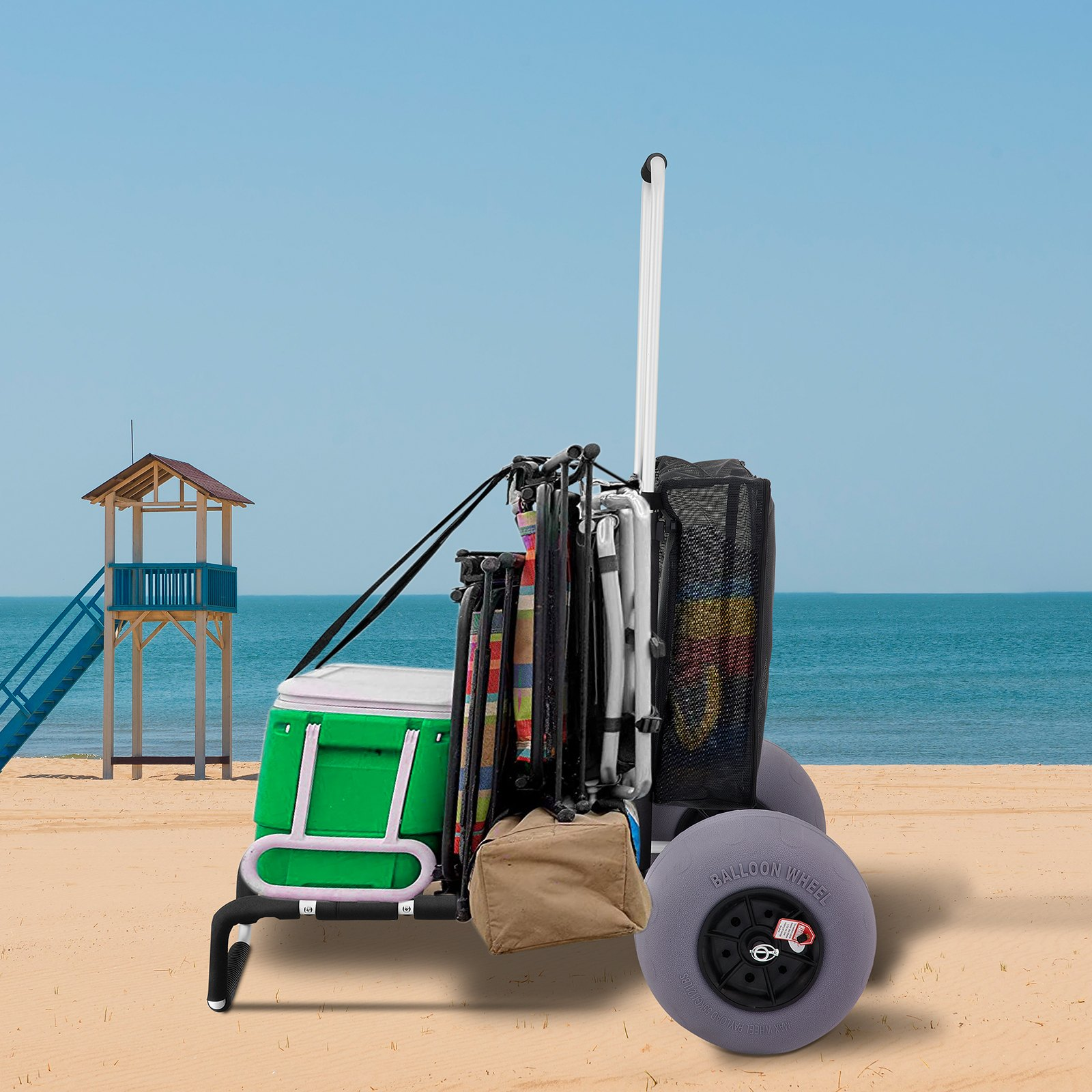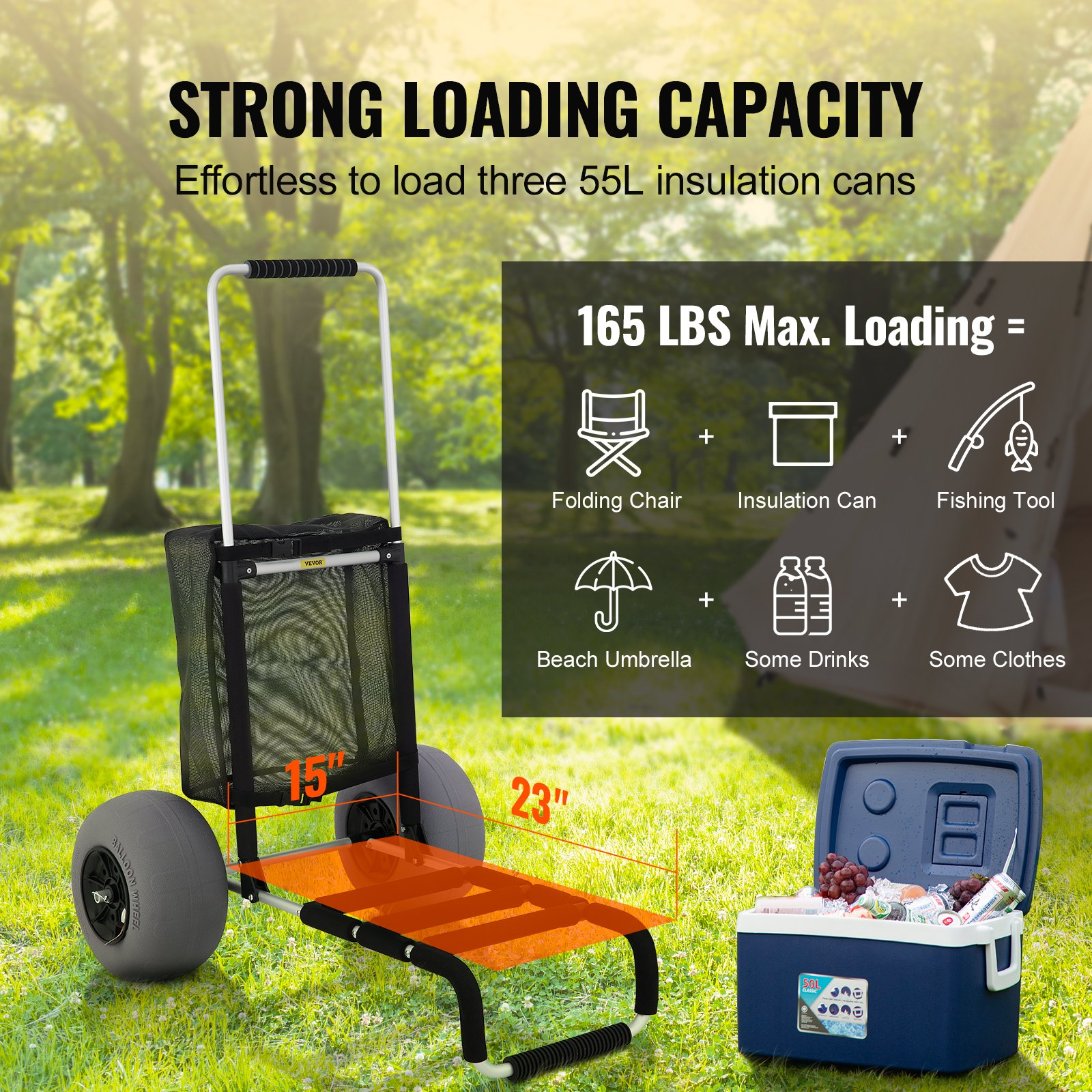 PRODUCT DESCRIPTION VEVOR Beach Carts for Sand, 23" x 15" Cargo Deck, w/ 13" TPU Balloon Wheels, 165LBS Loading Folding Sand Cart & 33.1" to 51.6" Adjustable Height, Aviation Aluminum Cart for Picnic, Fishing, Beach
