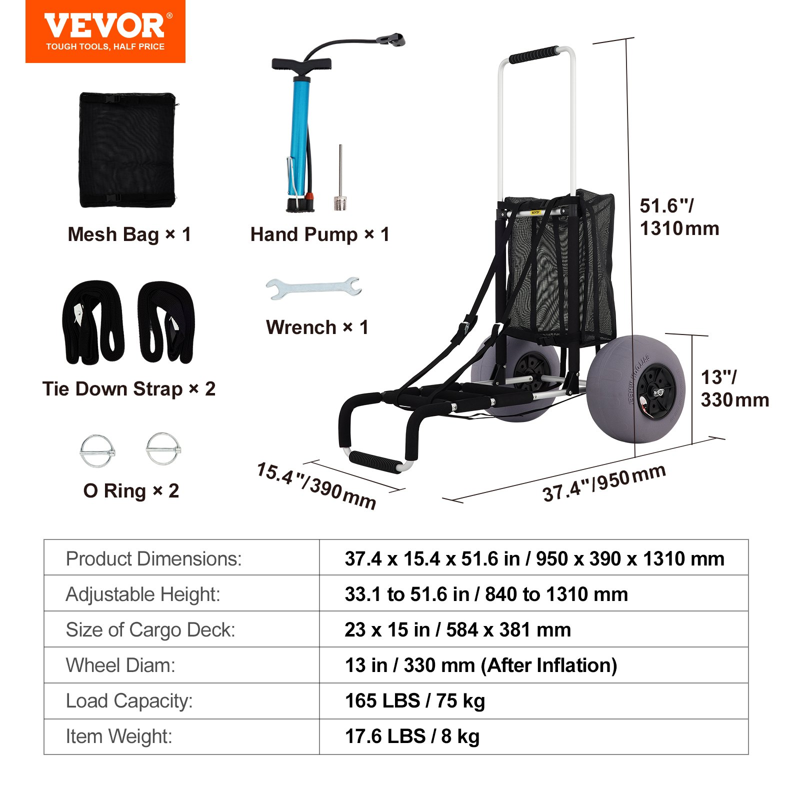 Load Capacity: 165 LBS/ 75 kg,Item Size: 37.4 x 15.4 x 51.6 in/ 95 x 39 x 131 cm,Height Range: 33.1 to 51.6 in/ 84 to 131 cm,Size of Cargo Deck: 23 x 15 in/ 58.4 x 38.1 cm,Wheel Diam.: 13 in/ 33 cm (After Inflation),Wheel Material: TPU,Item Weight: 17.6 LBS/ 8 kg