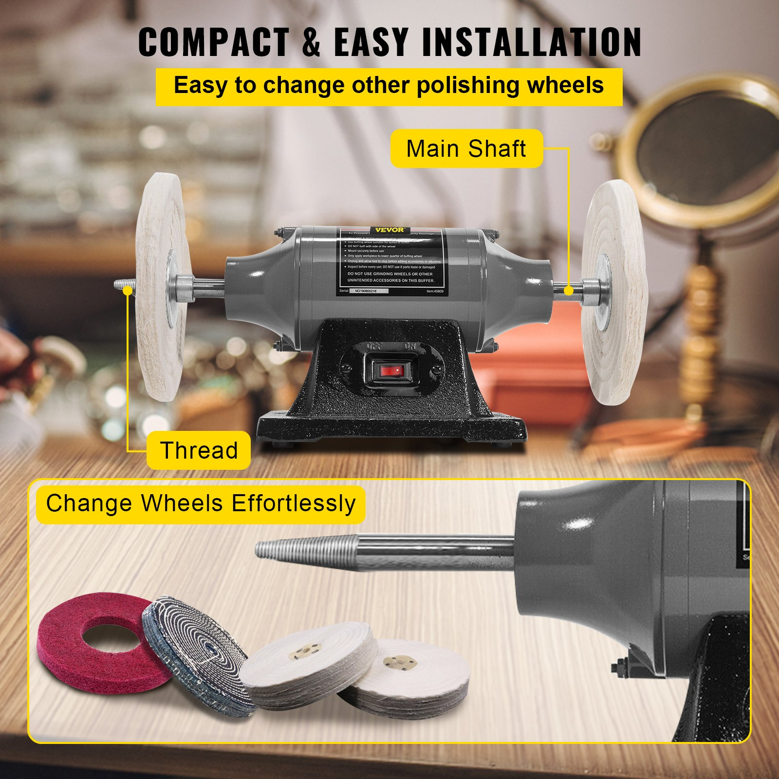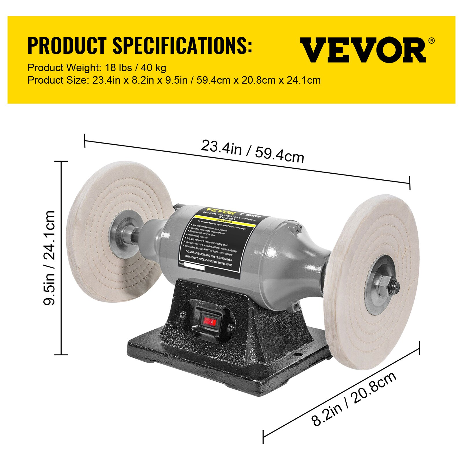 PRODUCT DESCRIPTION VEVOR Bench Buffer Polisher, 8 inch Buffing Machine 370W Motor with 3450 RPM, Heavy Duty Benchtop Lathe Polishing Machine for Jewelry, Wood, Silver, Amber, Metal, Jade