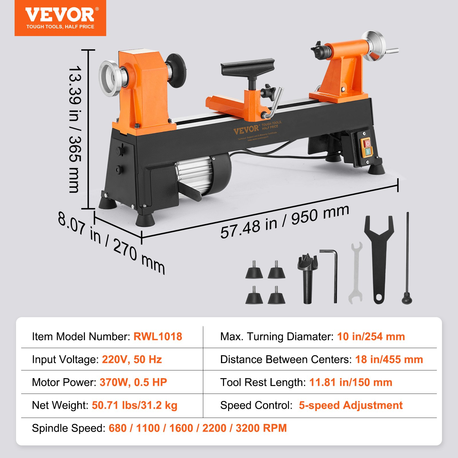 Spindle Speed: 780/1320/1920/2640/3840 RPM,Max. Turning Diameter: 10 in/254 mm,Distance Between Centers: 18 in/455 mm,Item Model Number: RWL1018,Motor Power: 370W, 0.5 HP,Input Voltage: 120V, 60 Hz,Tool Rest Length: 11.81 in/150 mm,Speed Control: 5-speed Adjustment,Product Dimensions: 57.48 x 8.07 x 13.39 in/950 x 270 x 365 mm,Net Weight: 50.71 lbs/31.2 kg