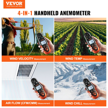 PRODUCT DESCRIPTION VEVOR Bluetooth Handheld Anemometer, 14?-140?, Digital Wind Speed Meter Gauge with LED Backlight Screen, Measures Wind Velocity Wind Temperature Air Flow Wind Chill, for Surfing Drone Flying HVAC