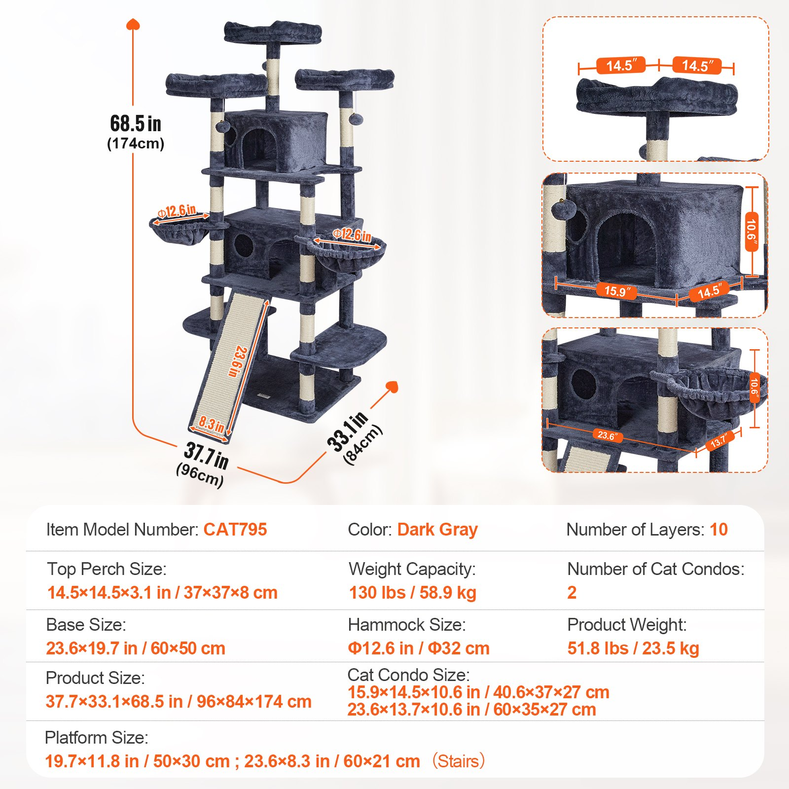 Cat Condo Size: 15.9"×14.5"×10.6"/40.6×37×27 cm;23.6"×13.7"×10.6"/60×35×27cm,Hammock Size: ?12.6"/?32cm,Top Perch Size: 14.5"×14.5"×3.1 "/37×37×8 cm,Number of Layers: 10,Number of Cat Condos: 2,Weight Capacity: 130 lbs/58.9 kg,Base Size: 23.6"×19.7"/60×50cm,Color: Dark Grey,Item Model Number: CAT796,Product Weight: 51.8 lbs/23.5 kg,Product Size: 37.7"×33.1"×68.5"/96×84×174 cm