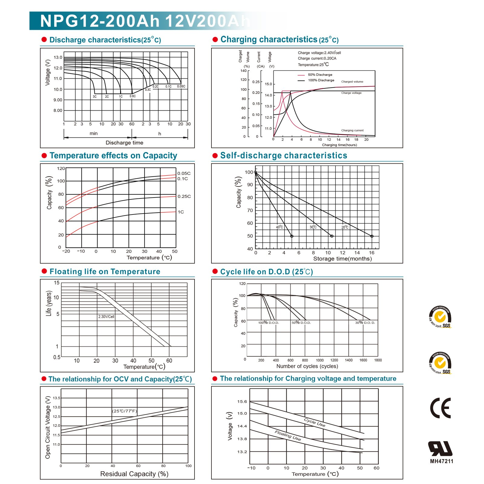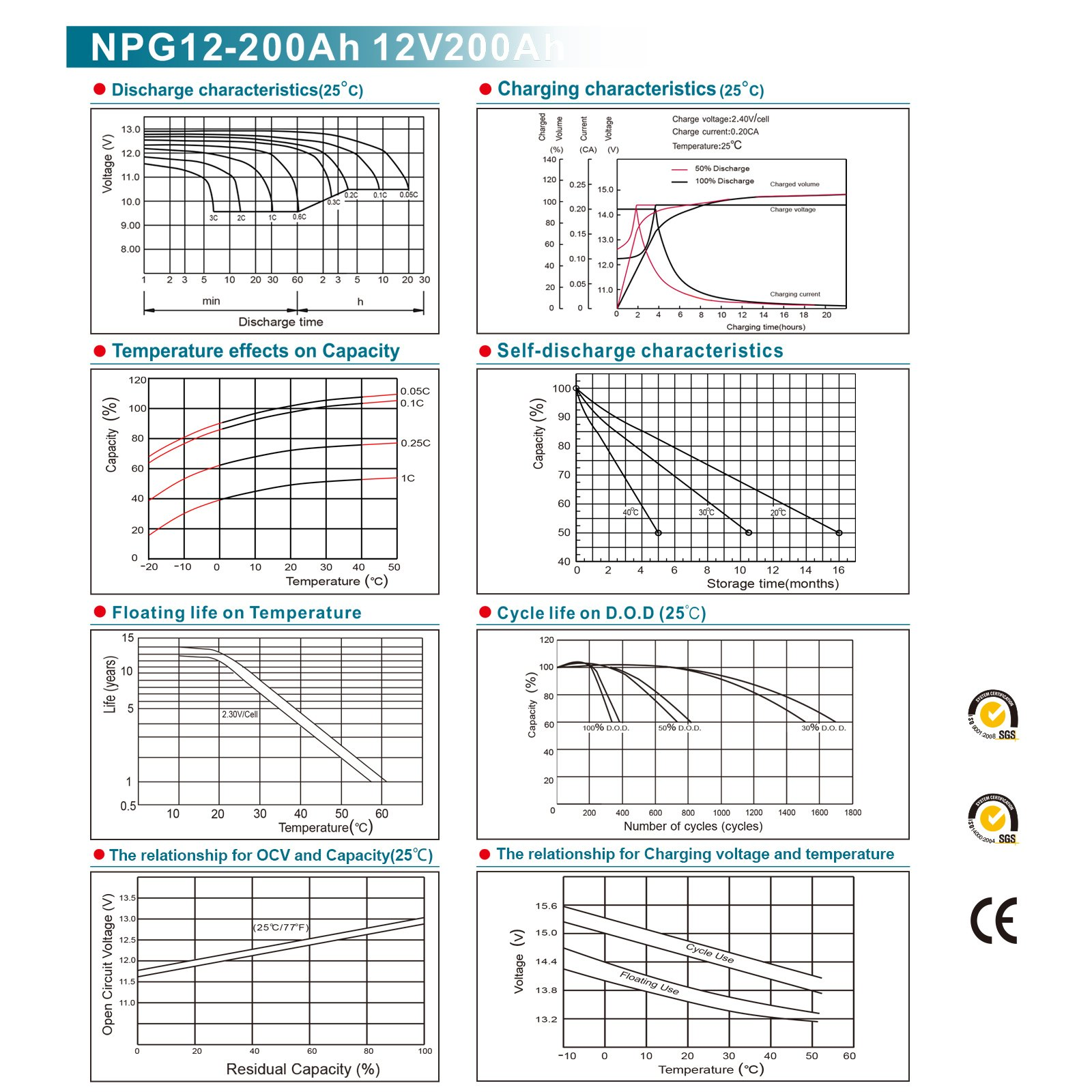 Capacity: 200Ah,Voltage: 12V,Item Model Number: NPG12-200Ah,Product Weight: 116.4 lbs / 52.8 kg,Product Dimensions: 21.7 x 9.4 x 8.7 in / 522 x 238 x 222 mm,Discharge Temperature: 5? to 122?,Storage Temperature: -4? to 122?