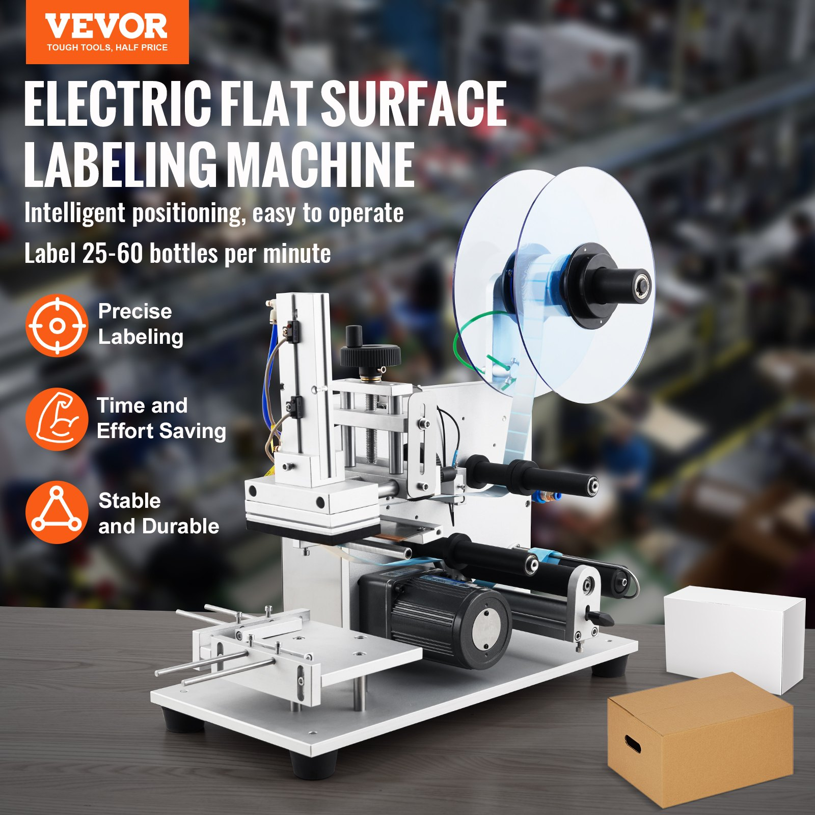 PRODUCT DESCRIPTION VEVOR Electric Flat Labeling Machine, 25-60pcs/min, Flat Surface Label Applicator for Cardboard Boxes/Square Bottles/Tin Cans, Labeler Suitable for Item Size Range of 4.72 x 5.9 x (0.98-3.54) inches