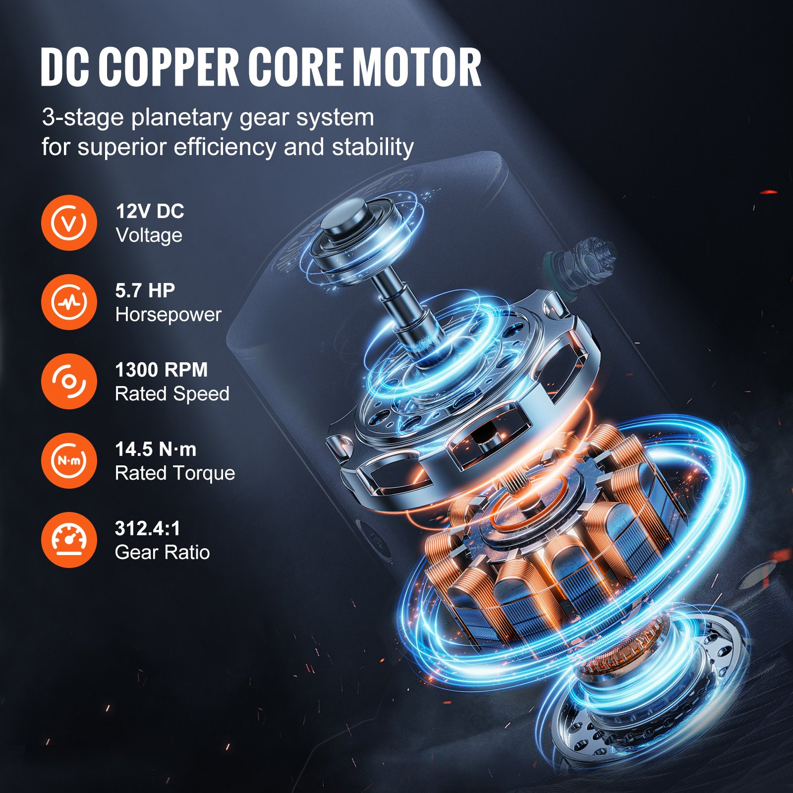 Waterproof Rating: IP55,Remote Control: Wireless + Wired Remote Control,Item Model Number: SEC16800T,Voltage/Horsepower: 12V DC/5.7 HP,Cable Material: Steel, 19 Strands,Cable Specifications: Φ7/16 in x 85 ft/Φ1.1 x 2590.8 cm,Gear Ratio: 312.4:1,Item Dimensions: 22.4 x 7.6 x 8.5 in/56.9 x 19.3 x 21.7 cm,Rated Line Pull Capacity: 18000 lbs/8165 kg,Net Weight: 96.8 lbs/43.9 kg,Main Material: Alloy Aluminum, Steel, Copper, Plastic (PPS and PA, etc.),Wireless Remote Control Distance: 65.61 ft/20 m