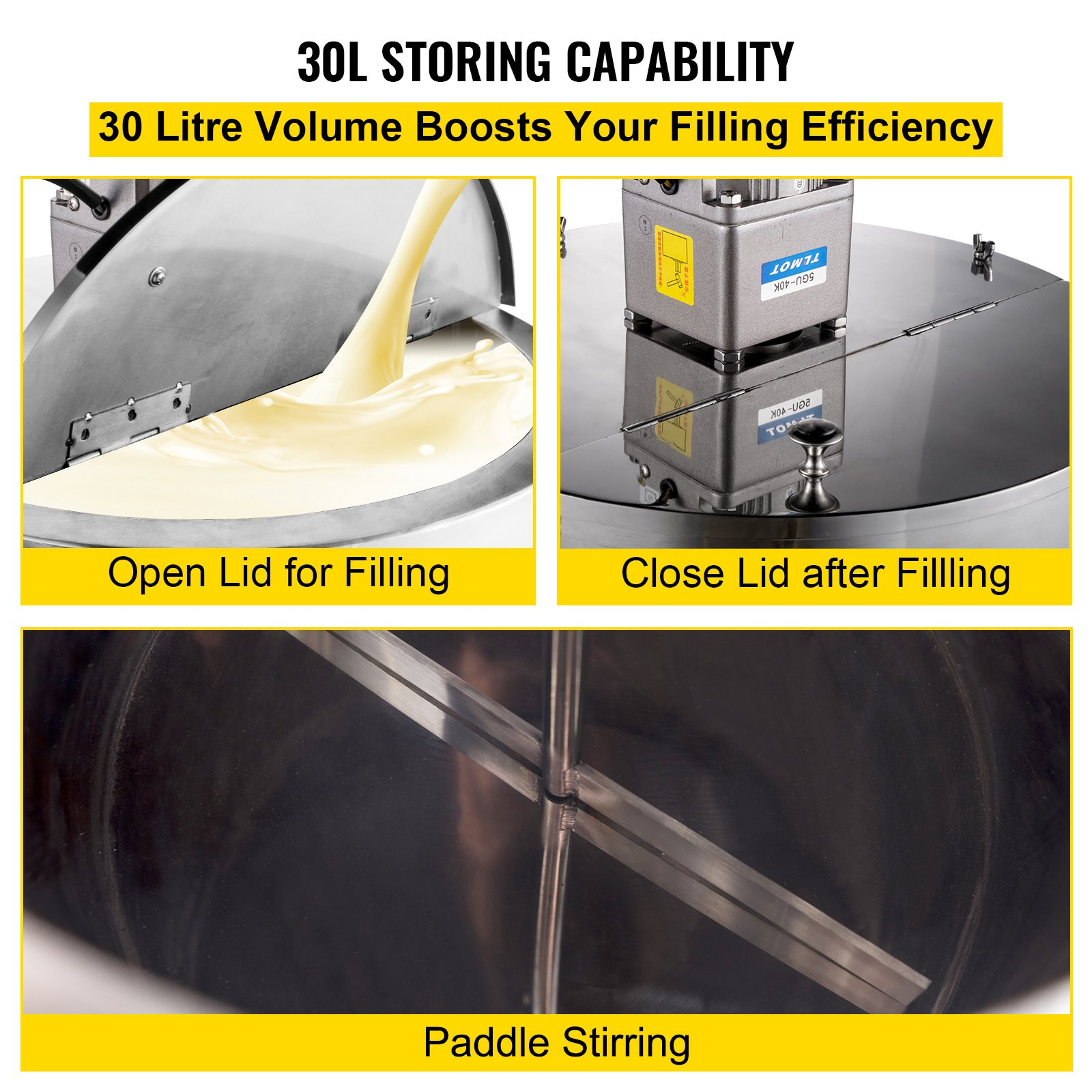 PRODUCT DESCRIPTION VEVOR Heating Mixing Filling Machine, 30L/7.9 Gal Lipstick Filling Machine, 35W Lipstick Filler, Heating and Stirring Filling Machine with Stirrer for Cosmetics, Drink, Lipstick, Wax and Nail Polish