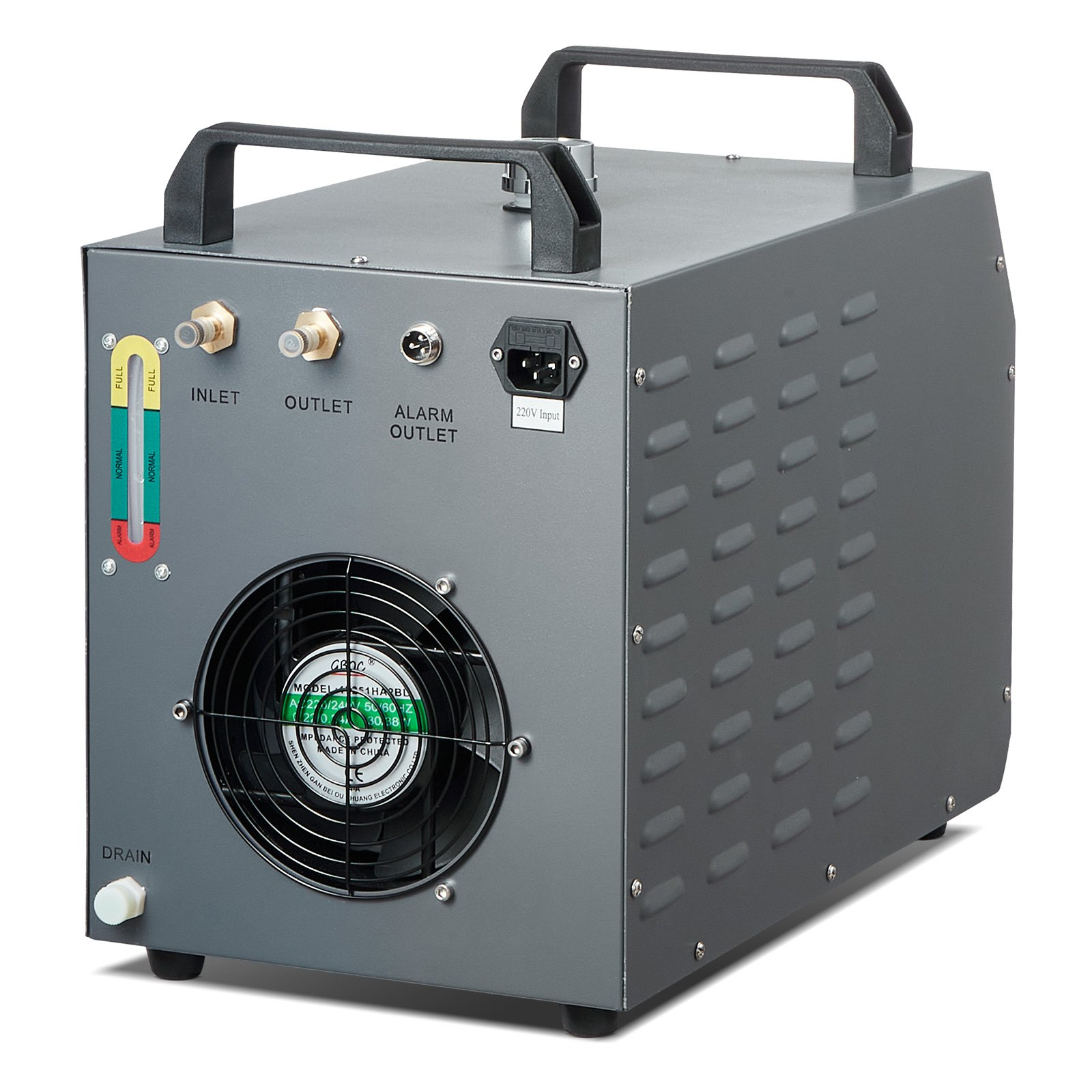Water Tank Capacity: 12 L,Item Model Number: CW3000,Maximum Flow Rate: 12 L/min,Product Net Weight: 19.8 lbs/9 kg,Rated Power: 80W,Number of Cooling Equipment: 1,Cold Water Inlet/Outlet Port Diameter: ? 0.4 in/10 mm,Main Material: Carbon Steel, Aluminum Alloy