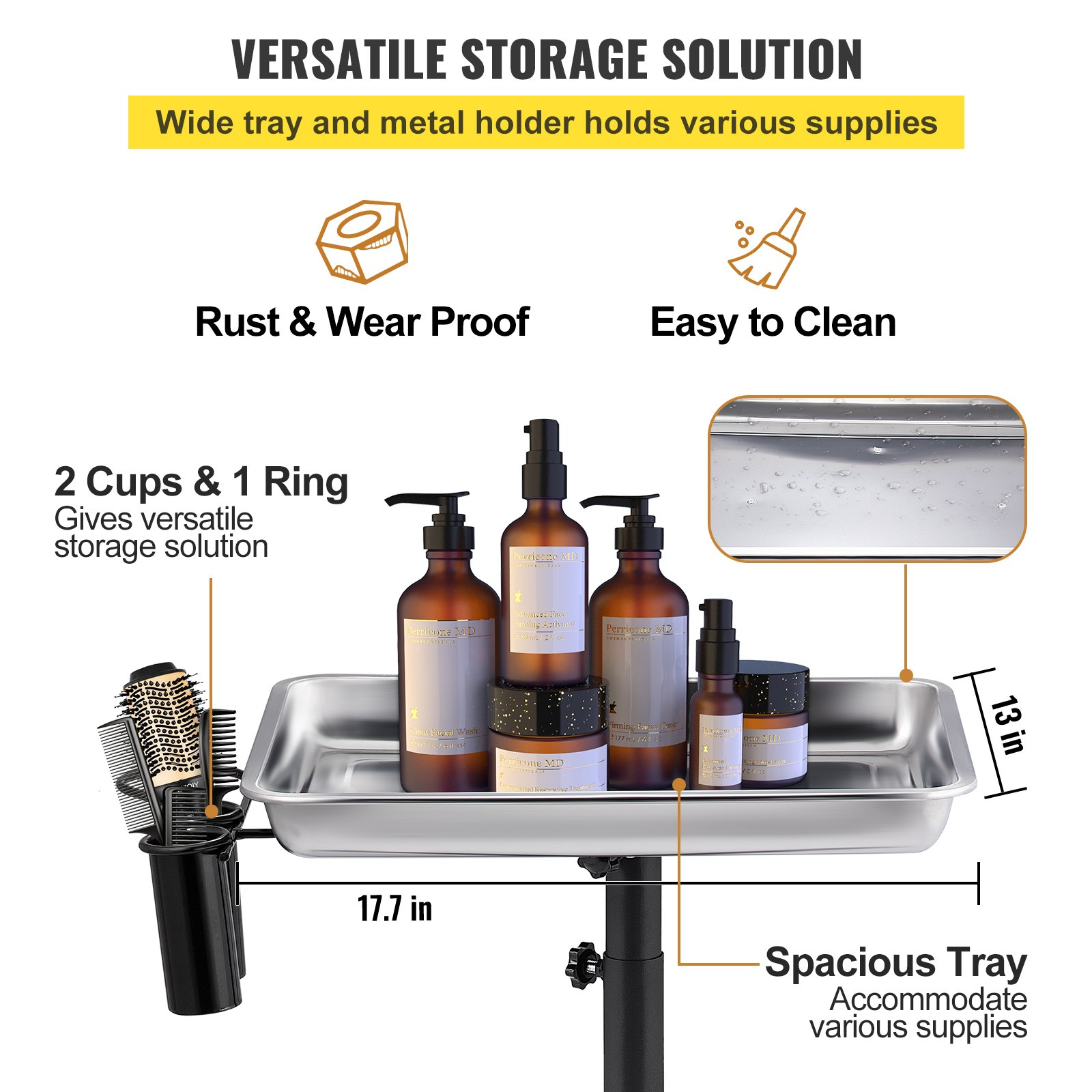 VEVOR Mayo Stand Medical Tray, Height Adjustable Stainless Steel Salon Tray Easy Assemble Tattoo Cart Lab Tray with 2 Cups & 1 Metal Ring for SPA Clinic Personal Care Lab Hospital Dentistry, Silver