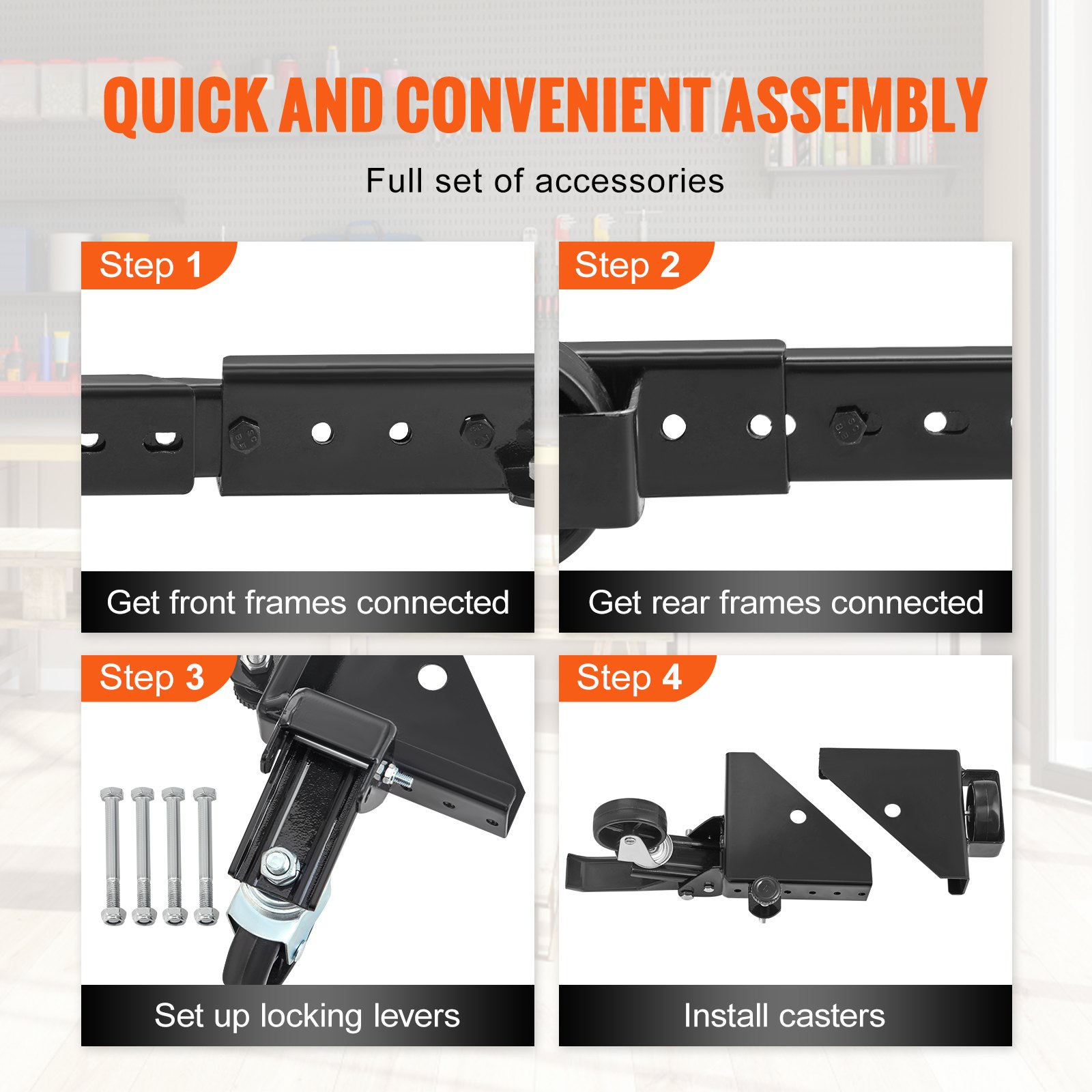 Load Capacity: 700 lbs / 317.5 kg,Item Model Number: GZB88093,Product Weight: 18 lbs / 8.3 kg,Material: Q235 Carbon Steel,Wheel Diameter: 3" / 76 mm,Adjustable Size: 15" x 15" to 36" x 36" / 381 x 381 mm to 914 x 914 mm,Number of Wheels: 2 Directional Wheels + 2 Swivel Wheels
