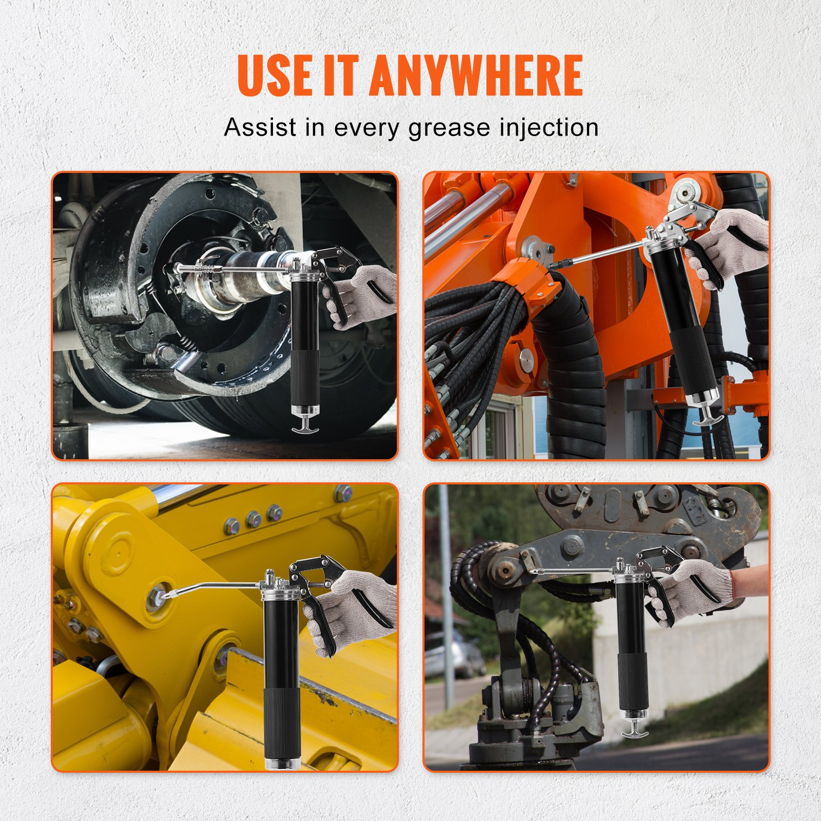 PRODUCT DESCRIPTION VEVOR Pistol Grip Grease Gun, 6000 PSI, 14 OZ / 400 CC Capacity Heavy Duty Professional Grease Gun, with 19.69 Inch Flexible Hose 2 Black Flat Couplers, 1 Pointed Coupler, and 2 Rigid Metal Pipe