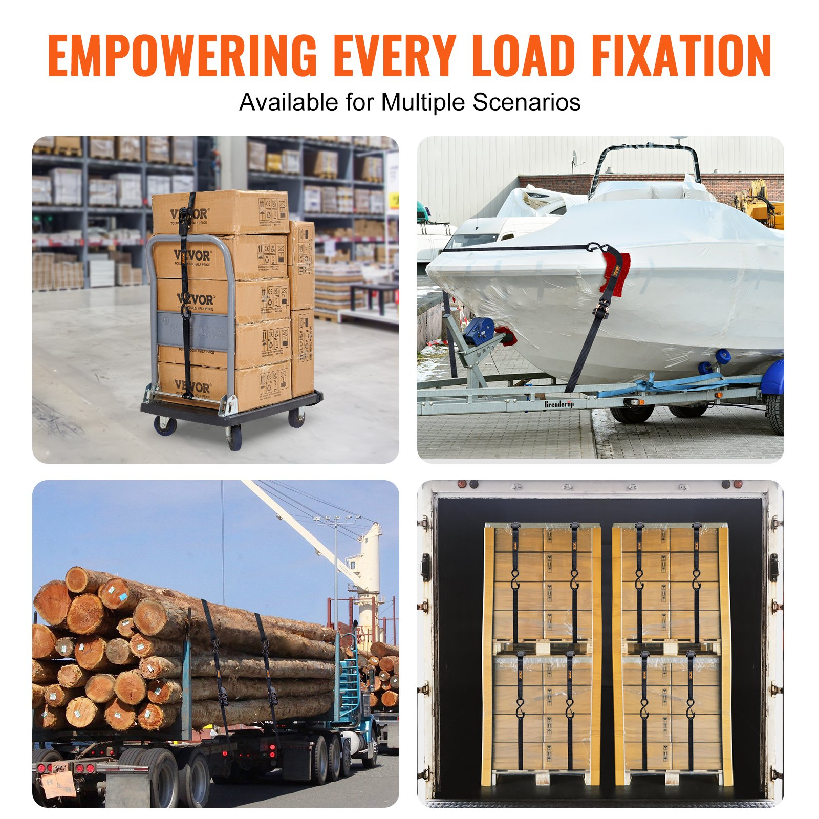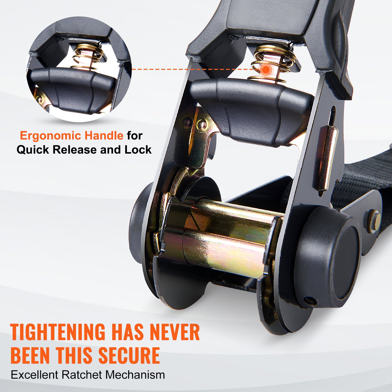 PRODUCT DESCRIPTION VEVOR Ratchet Tie Down Straps (4PK), 2200 lb Max Break Strength, Includes 4 Premium 1" x 15' Rachet Tie Downs with Padded Handles, for Moving Securing Cargo, Appliances, Lawn Equipment, Motorcycle
