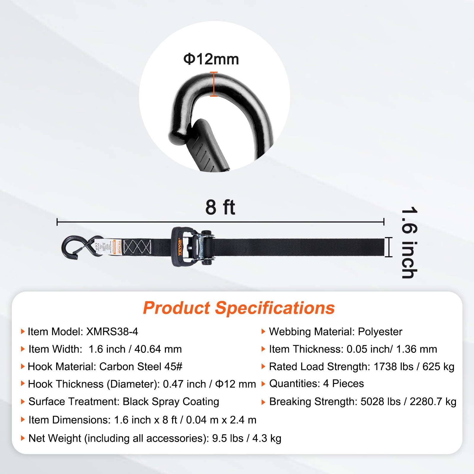 Rated Load Strength: 1738 lbs / 788 kg,Item Model: XMRS38-4,Item Thickness: 0.05 inch/ 1.36 mm,Hook Material: Carbon Steel 45#,Net Weight (including all accessories): 9.5 lbs / 4.3 kg,Breaking Strength: 5208 lbs / 2362 kg,Surface Treatment: Black Spray Coating,Hook Thickness (Diameter): 0.5 inch / ?13 mm,Item Dimensions: 1.6 inch x 8 ft / 0.04 m x 2.4 m,Quantities: 4 Pieces,Item Width: 1.6 inch / 40.64 mm,Webbing Material: Polyester