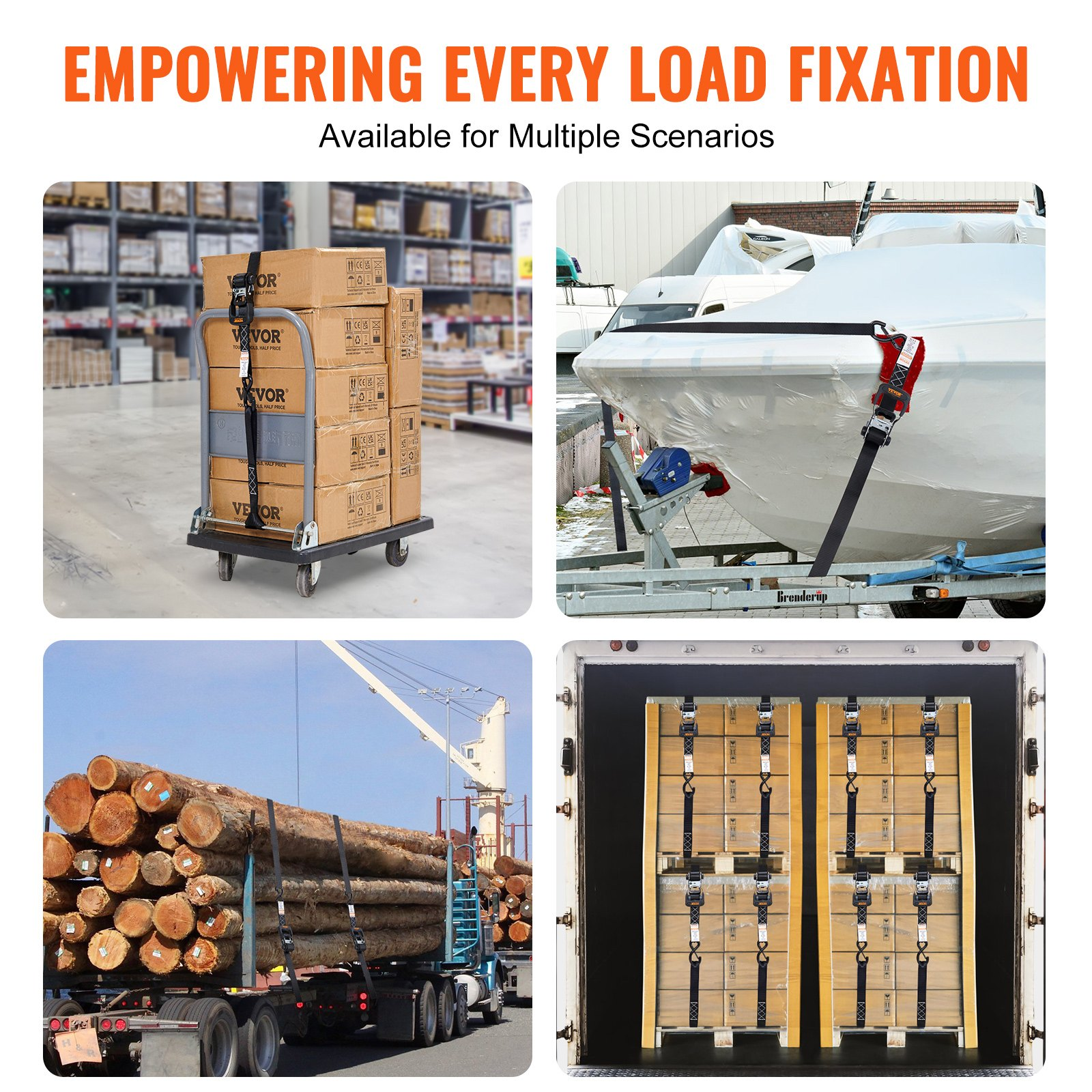 PRODUCT DESCRIPTION VEVOR Ratchet Tie Down Straps (4PK), 5208 lb Max Break Strength, Includes 4 Premium 1.6" x 8' Rachet Tie Downs with Padded Handles, for Moving Securing Cargo, Appliances, Lawn Equipment, Motorcycle