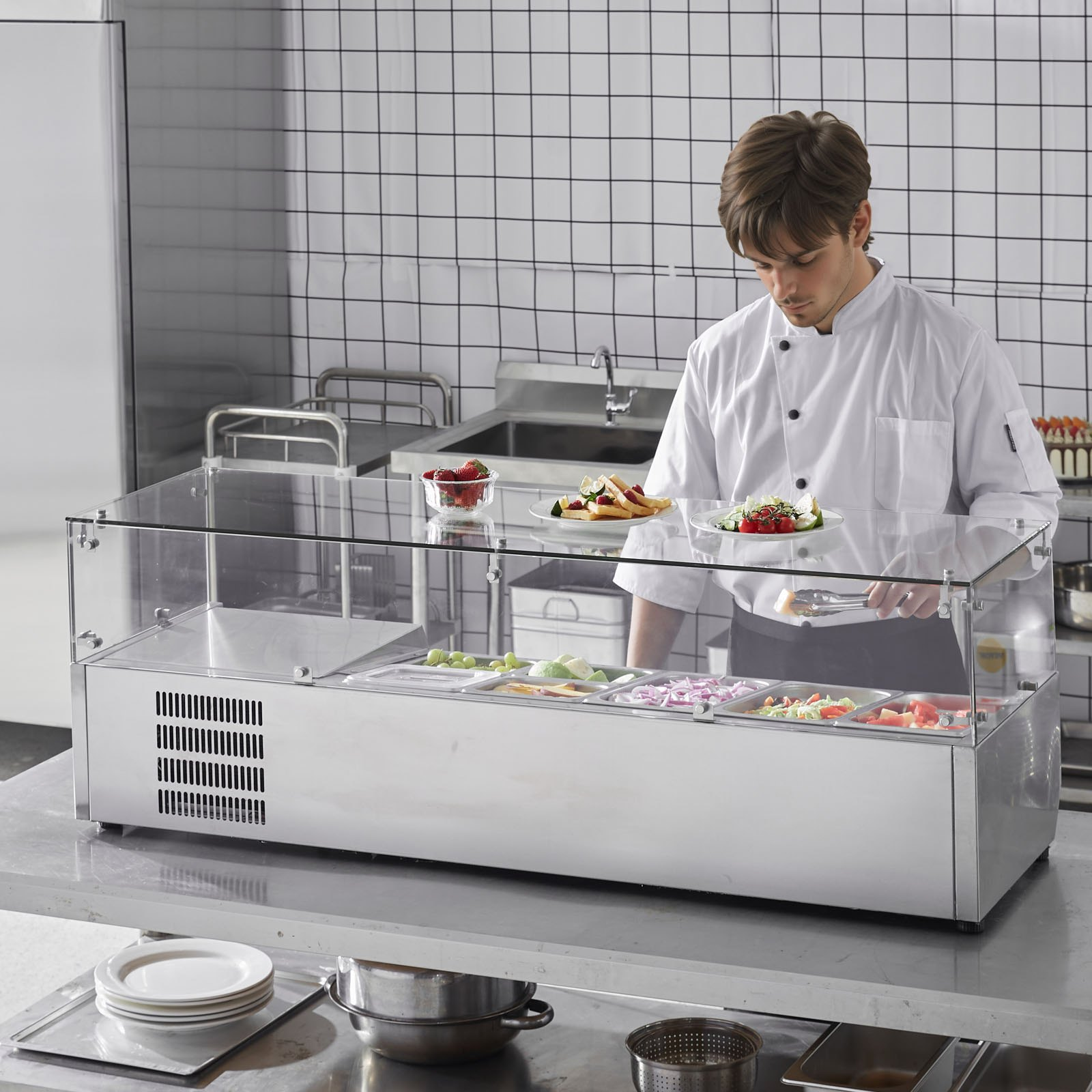 VEVOR Refrigerated Condiment Prep Station, 140 W Countertop Refrigerated Condiment Station, with 3 1/3 Pans & 4 1/6 Pans, 304 Stainless Body and PC Lid, Sandwich Prep Table with Glass Guard, ETL