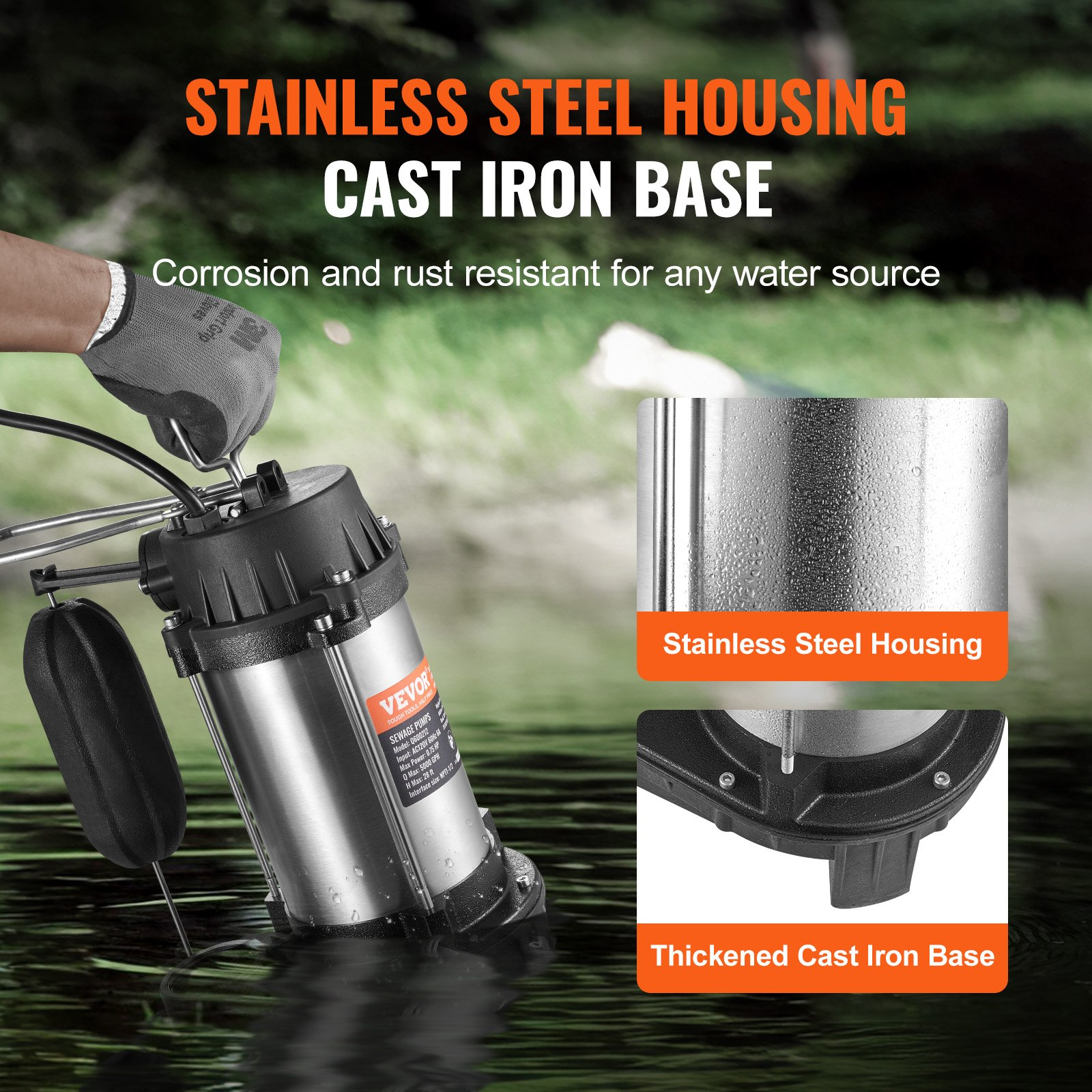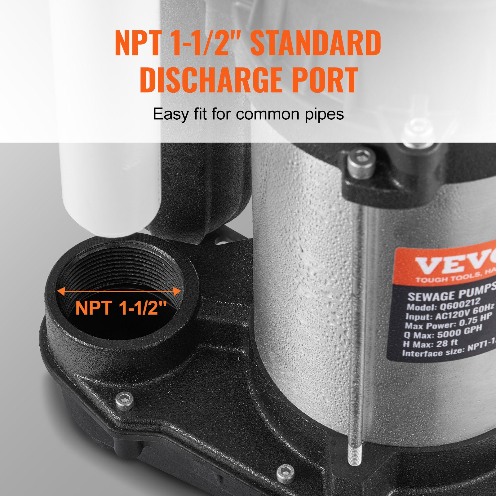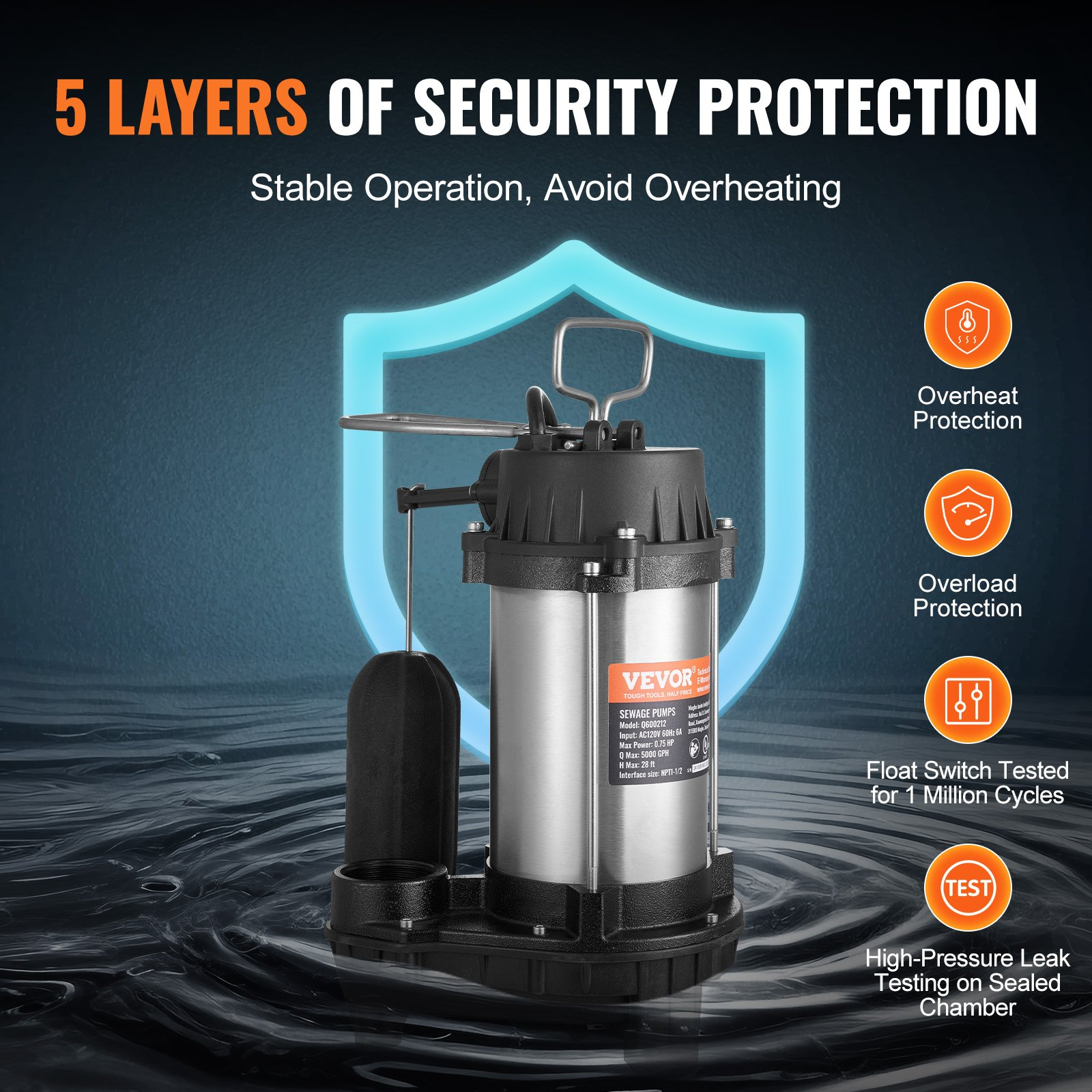 PRODUCT DESCRIPTION VEVOR Submersible Sewage Pump Water Pump 0.75HP 5000GPH 28 ft Lift for Basement