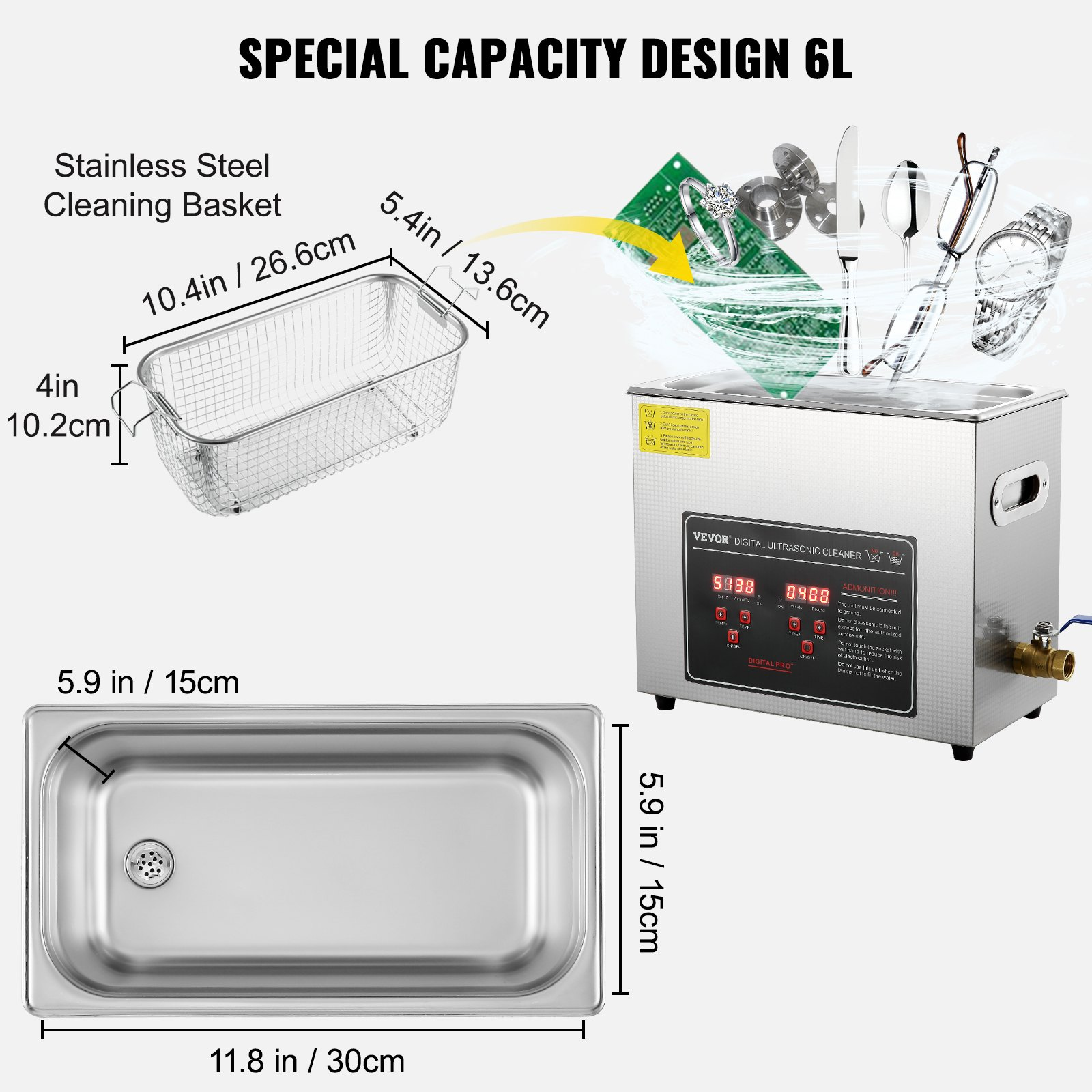 PRODUCT DESCRIPTION VEVOR Ultrasonic Cleaner with Digital Timer & Heater, Professional Ultra Sonic Jewelry Cleaner, Stainless Steel Heated Cleaning Machine for Glasses Watch Rings Small Parts Circuit Board (6L)