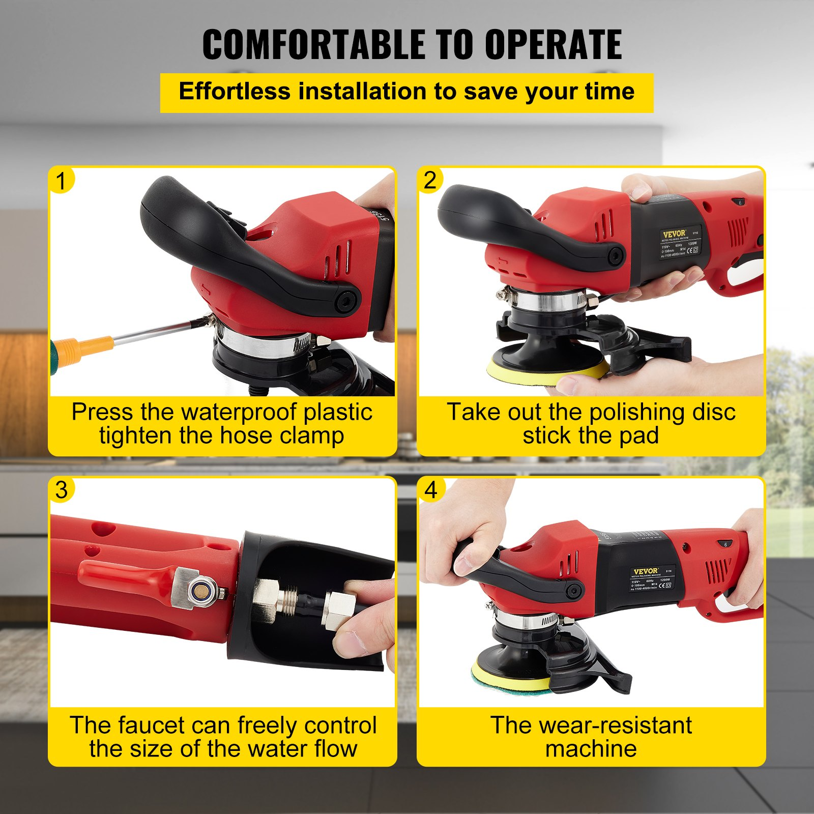 PRODUCT DESCRIPTION VEVOR Wet Polisher Grinder, Variable Speed 4" & 5" Diamond Polishing Pads, Buffing Machine with 78.7" Water Pipe Adapter & Splash Shield, Electronic Concrete Stone for Title Floor Countertop CE