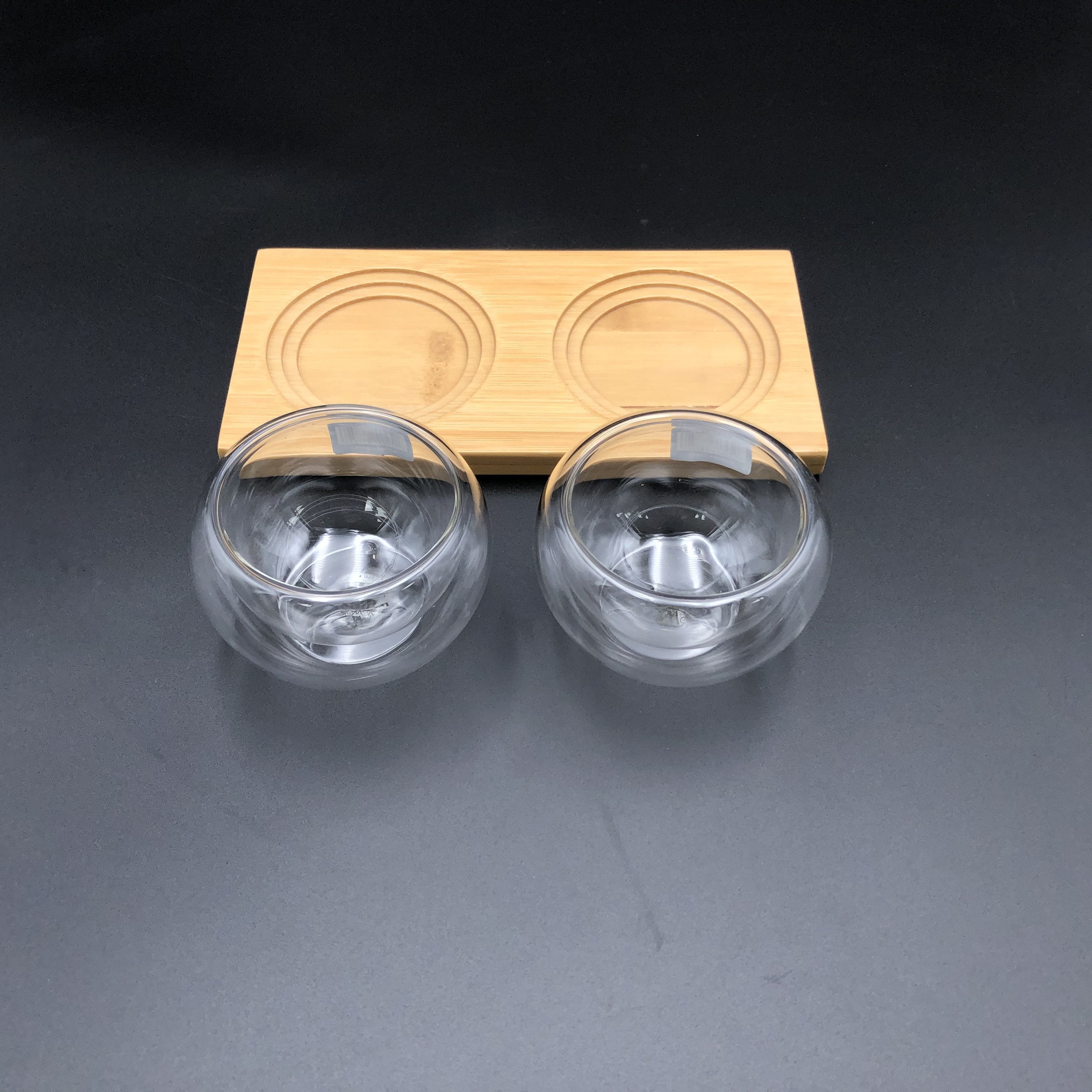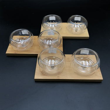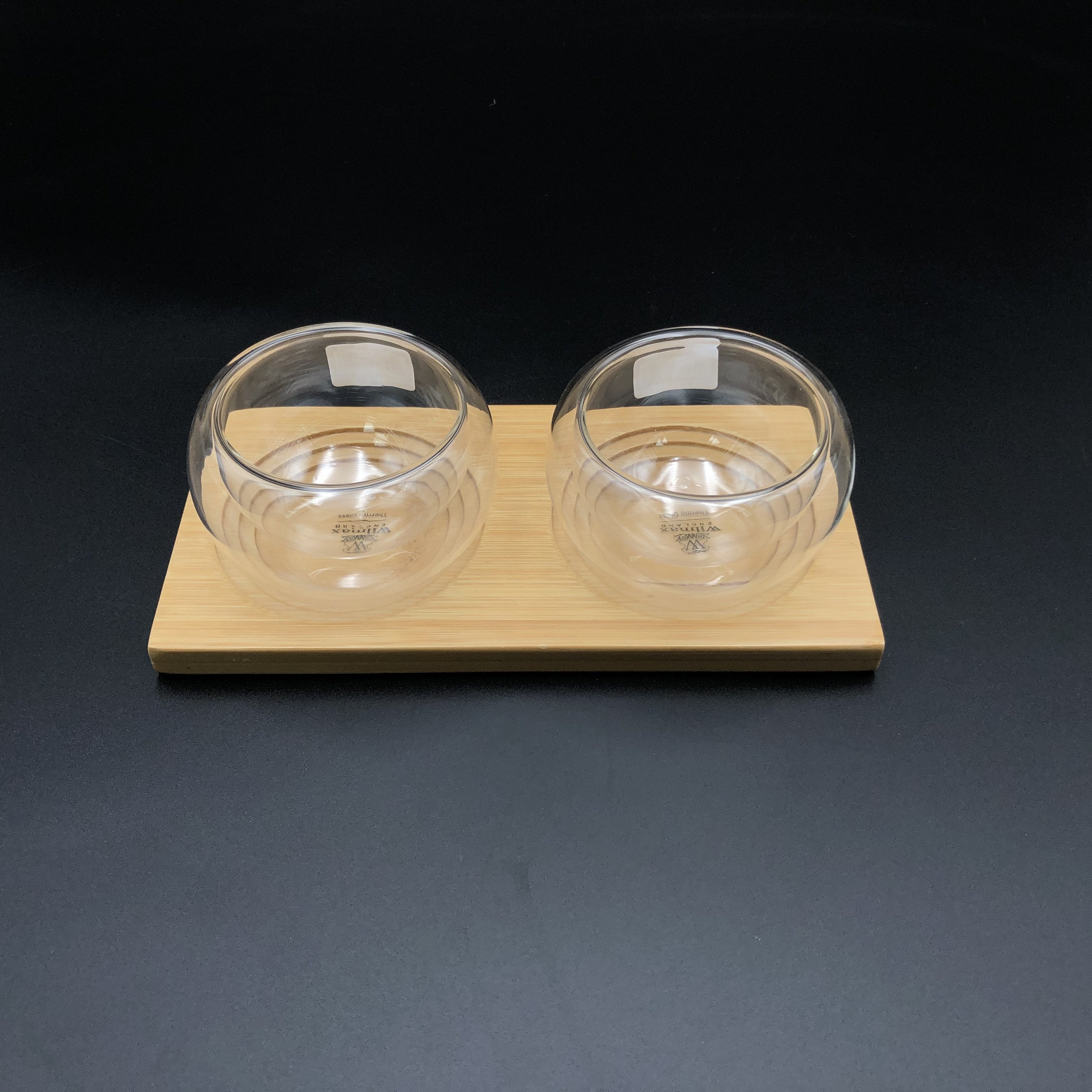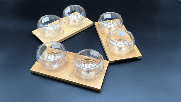 - This 9 piece set makes 3 perfect settings of two gang circle cutout bamboo trays with 2 thermo glass bowls. Your only limit is your imagination. Anything is possible with this amazing presentation set. Double walled bowls/cups will keep your hot liquids hot and your cold liquids cold 3-4 times longer.