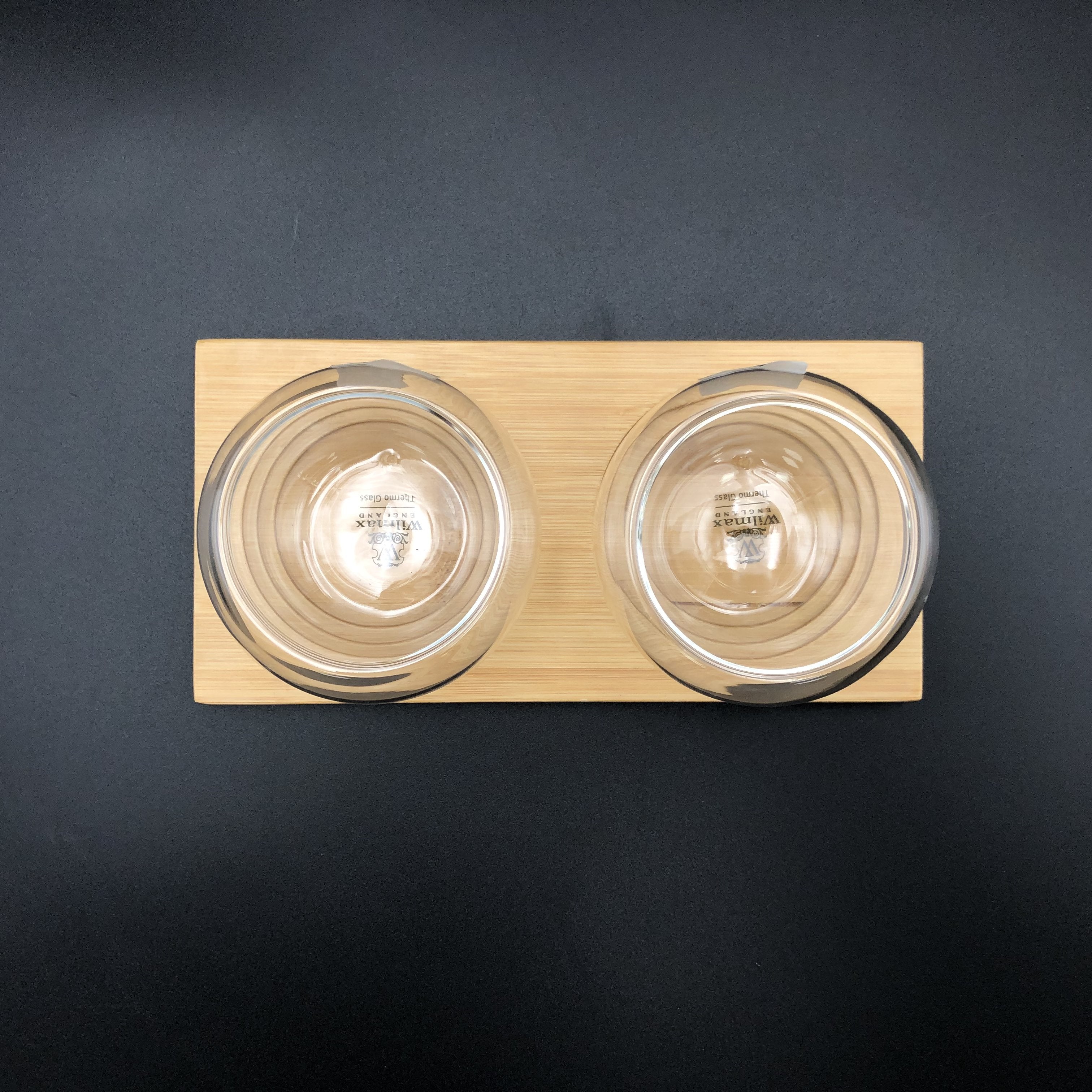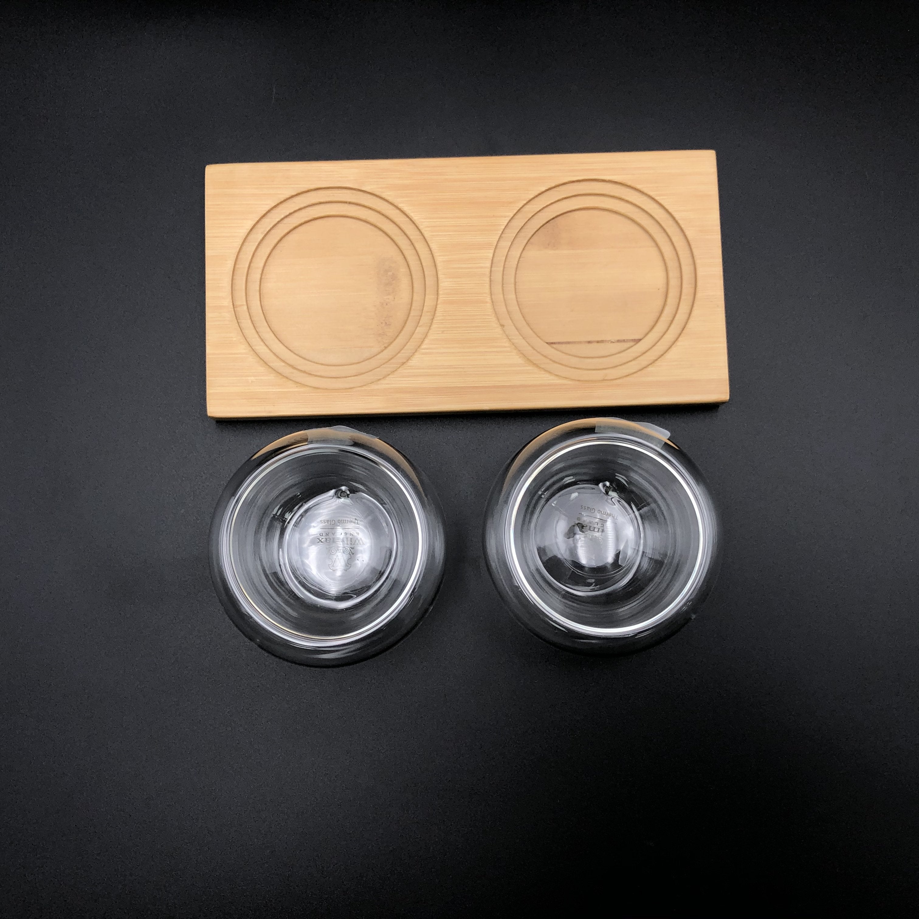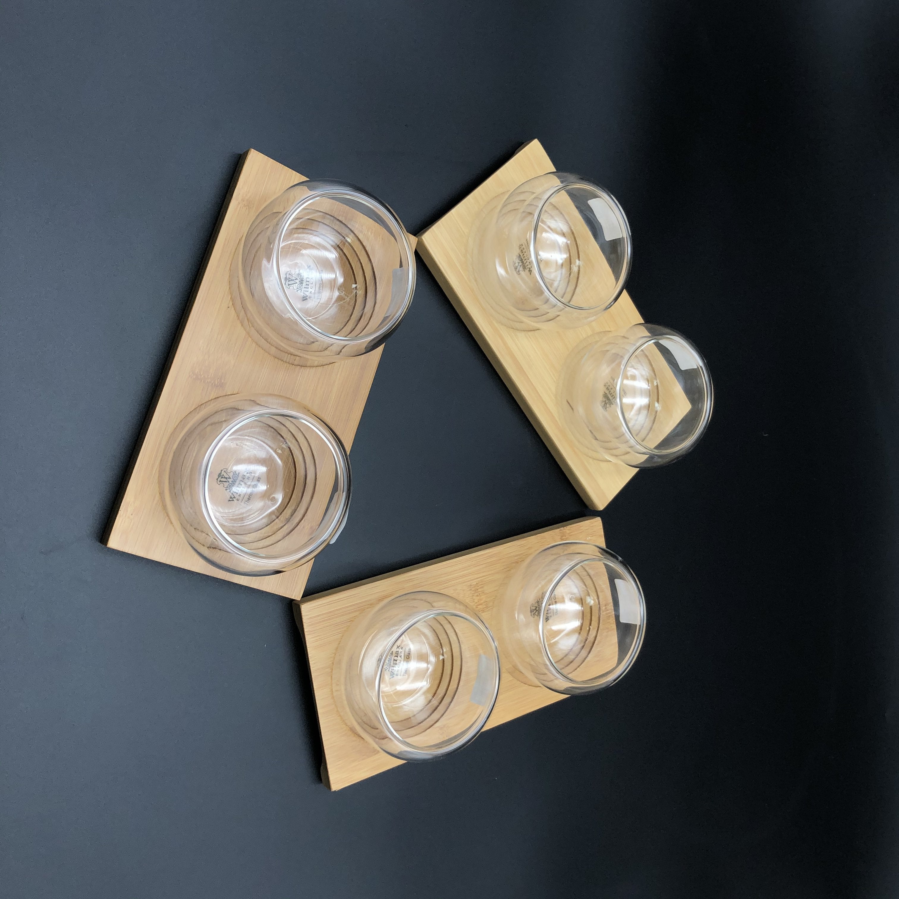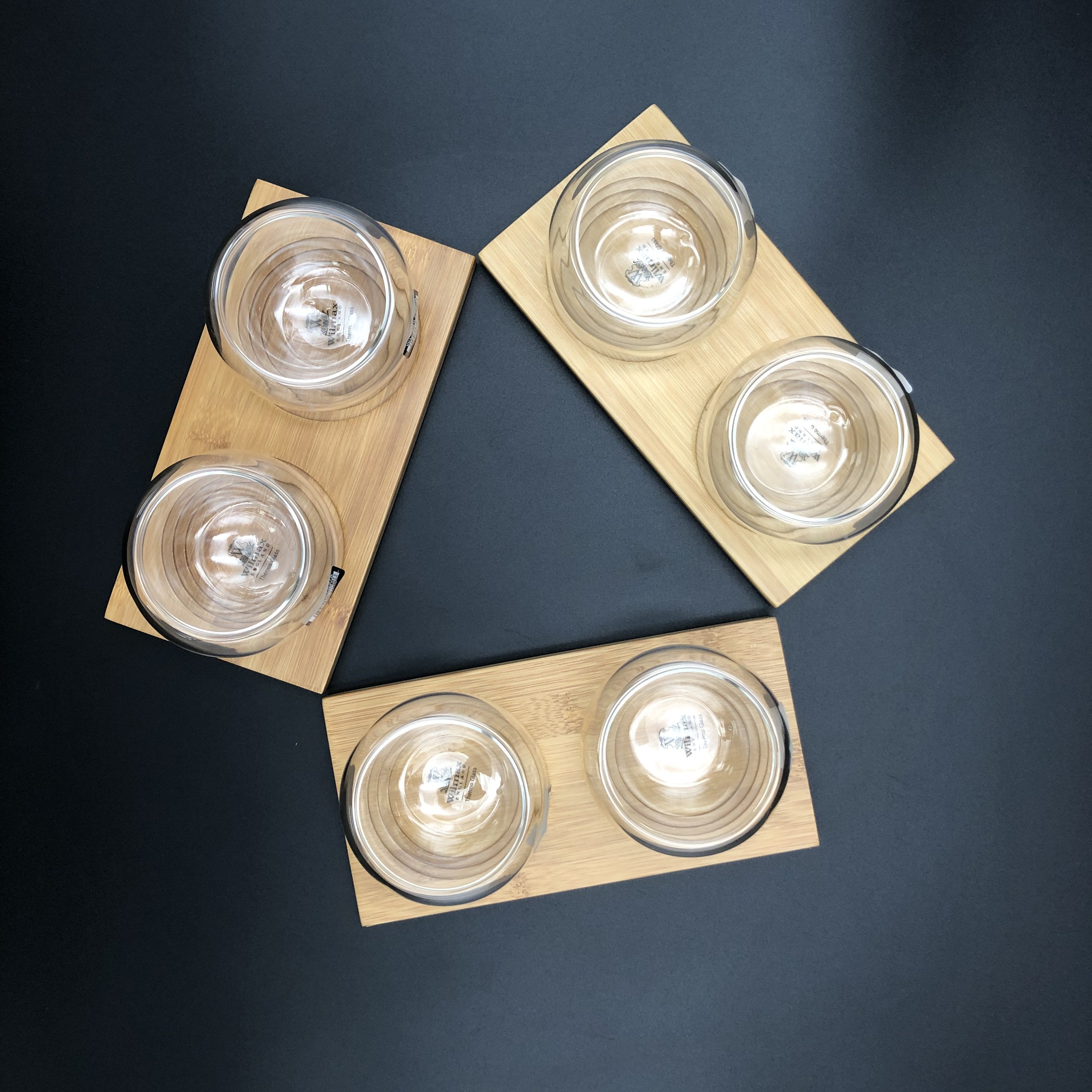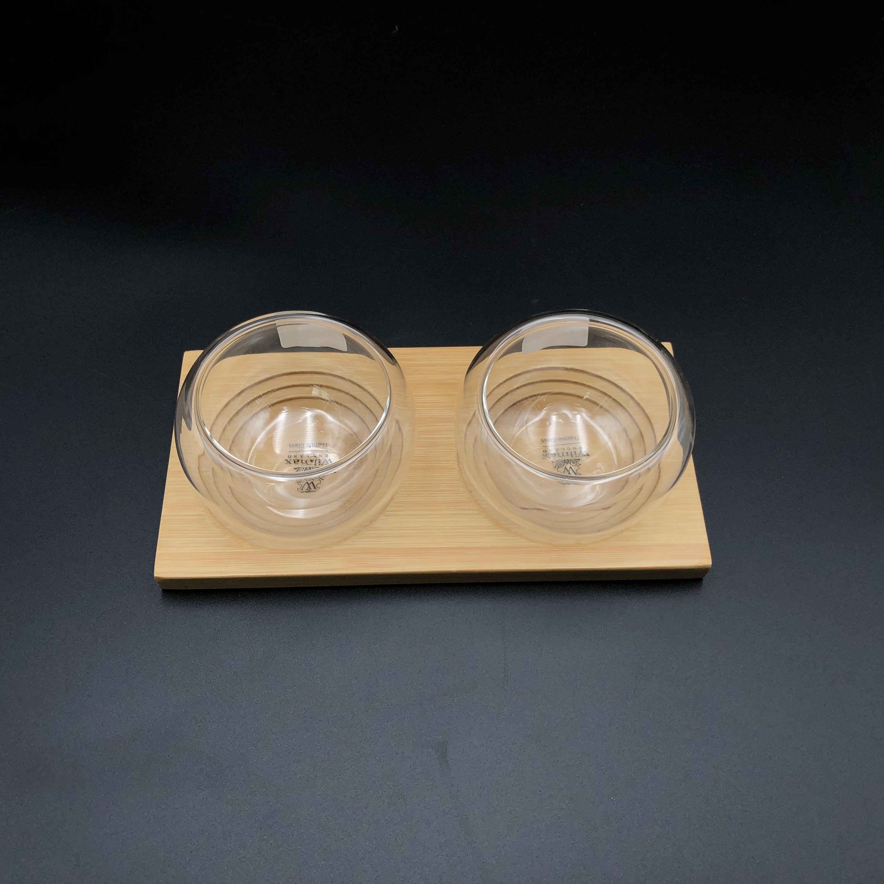 - Bamboo double tray sits 7. 75 long by 4 wide and has 2 perfect cut out circles to hold multiple diameter vessels safely inside. Rubber feet underneath are meant to keep it sturdy on a flat surface.