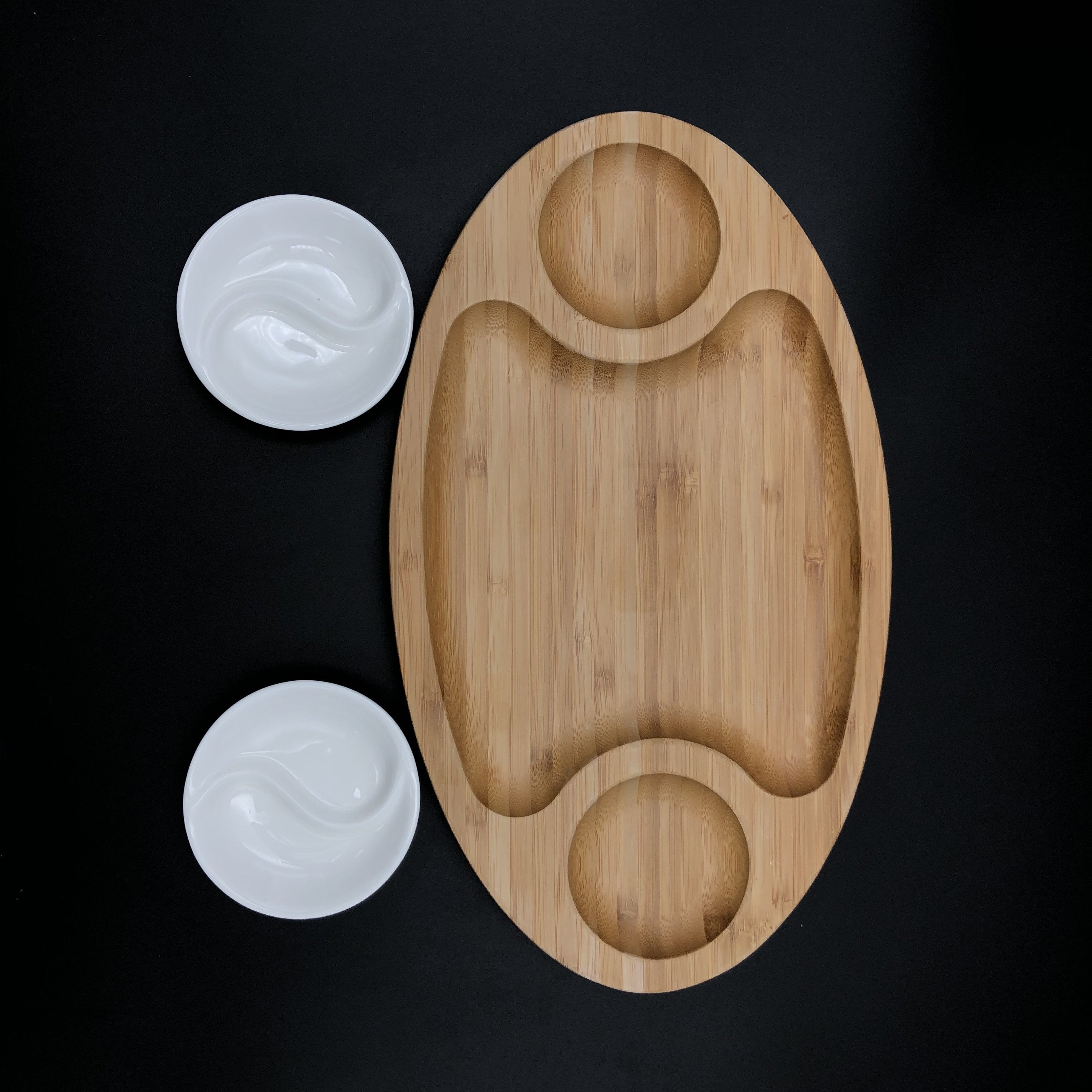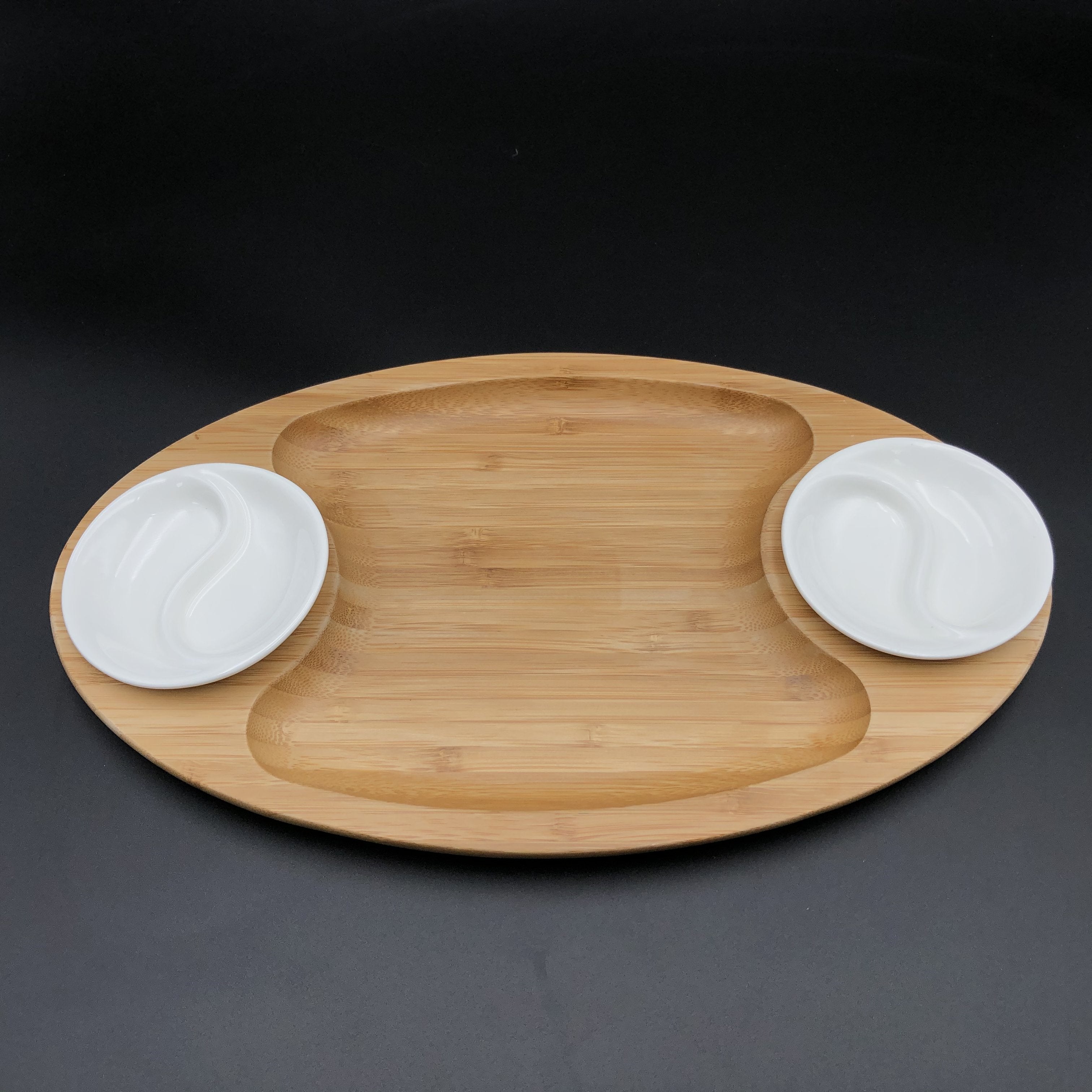 - Mix and match or surf and turf set, combines 100% natural bamboo serving tray with yin yang fine porcelain saucers to match the cutouts. Having unlimited possibilities from fish and chips to steak and fries and even beautifully roasted vegetables with dipping sauces.