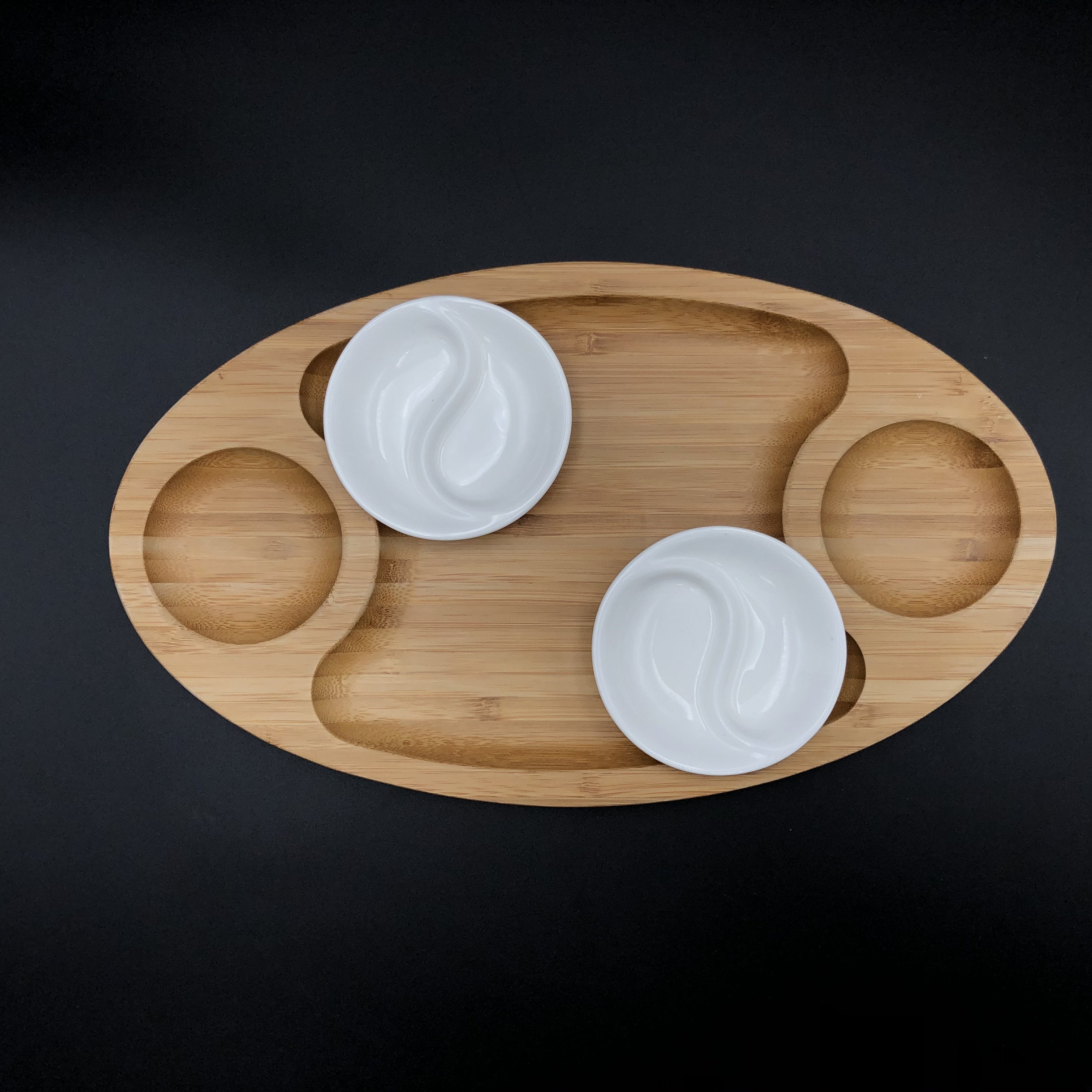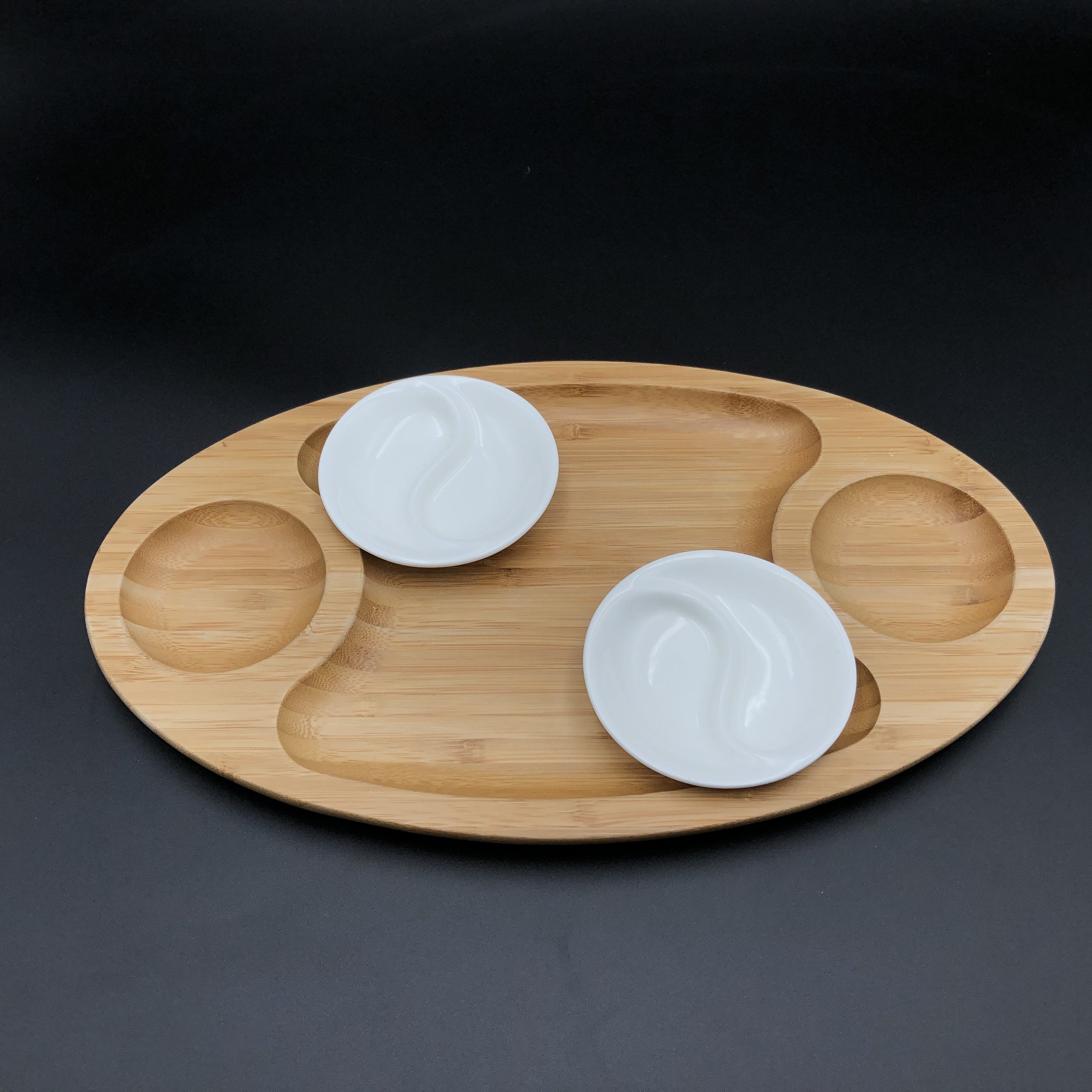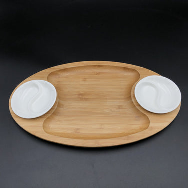 Fine Porcelain And Bamboo Serving Tray Combo Set With A Yin Yang 2 Section Saucer