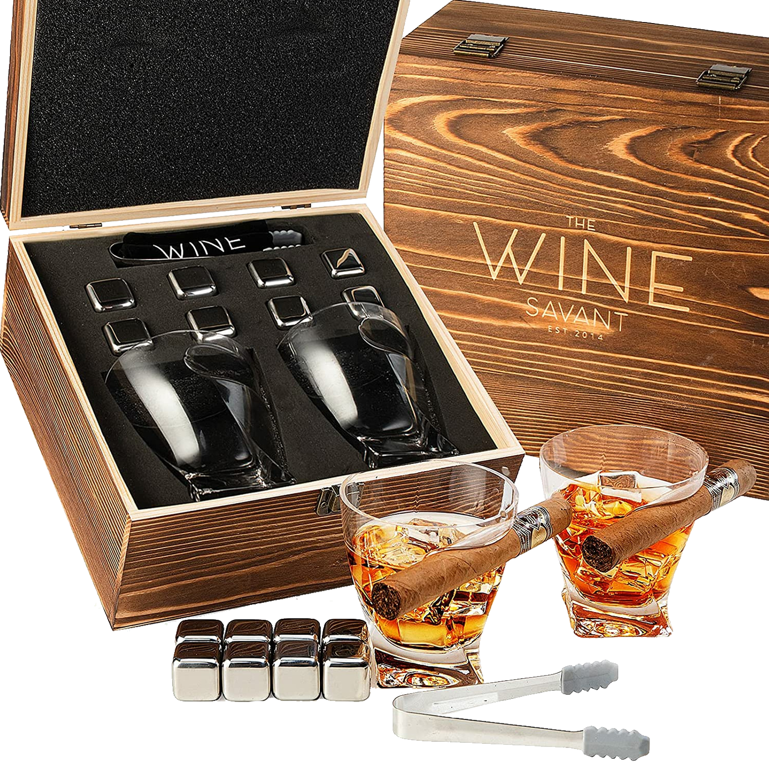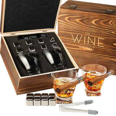 - AESTHETICALLY PLEASING: The Cigar glasses have an optical effect created by the interplay of broad cuts and contrasting angles. These funky and fun glasses have a space reserved for cigars in them! Ideal for whiskey lovers, this set includes all you need to create an impressive Old Fashioned cocktail for guests at home or while out on the town. Comes with 8 Cube whiskey stones and tongs all stored away in the elegant mahogany box!