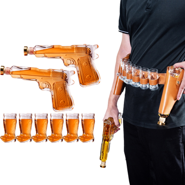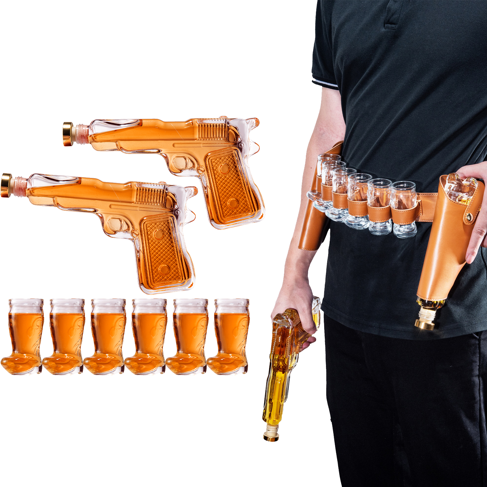 • DRINKING WHISKEY WILL NEVER BE THE SAME: Pistol Gun Decanter With Holster & 6 Whiskey Cowboy Boot Glasses is the ultimate crowd pleaser at your next get-together. Can you imagine how classy this will look in your bar? This handmade Pistol whiskey decanter gun will start your drinking with a bang. The gun with its details is sure to be a wonderful addition to any home bar.