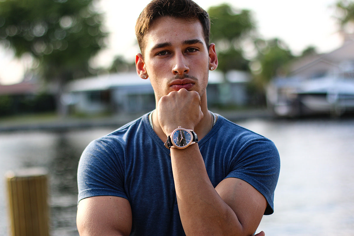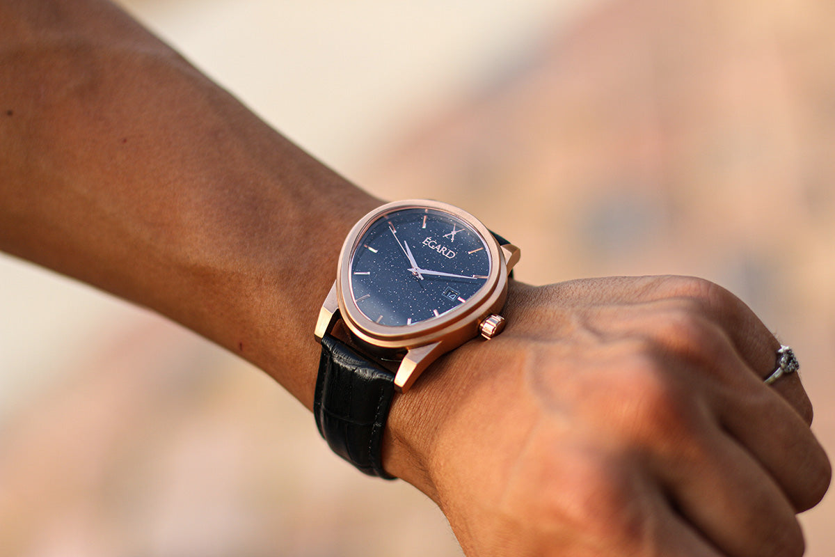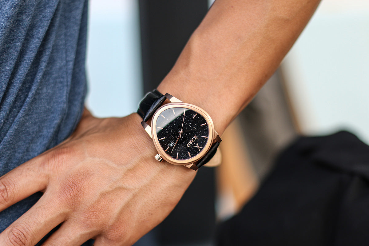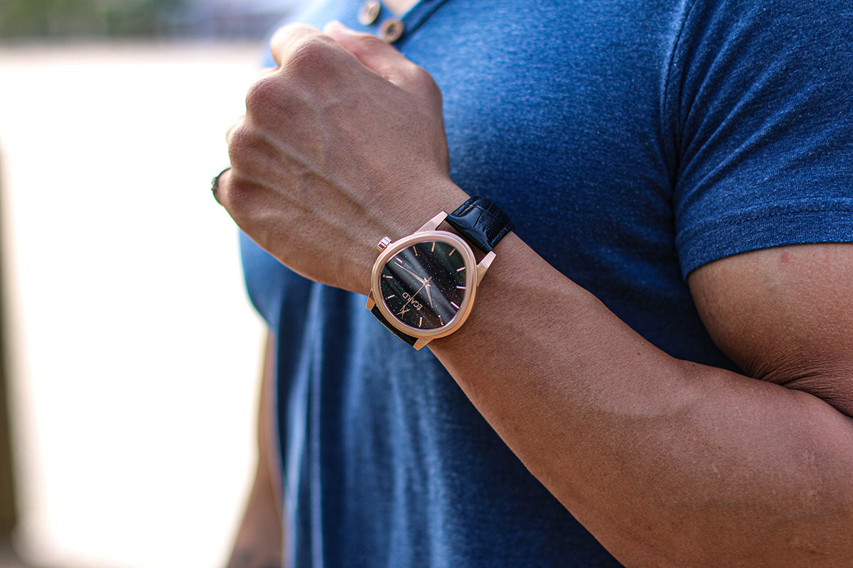 The Artist: For the gentleman who is seeking inspiration. The Dali V2's name comes from Salvador Dali's melting clock. The curved sapphire crystal and case offer a classic, elegant yet unique take on traditional aesthetics. The aventurine dial feels as the stars above us are contained inside the timepiece.