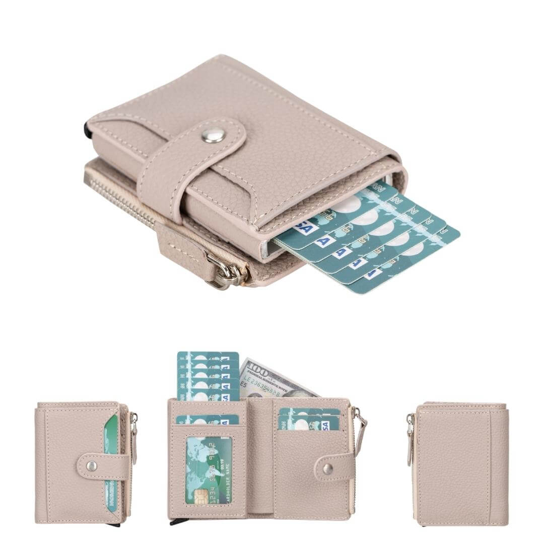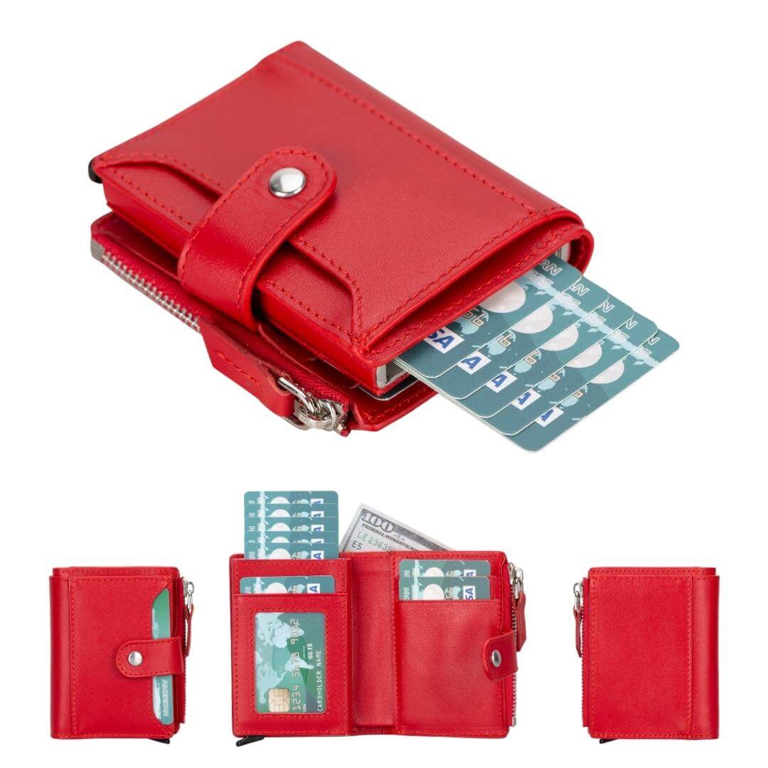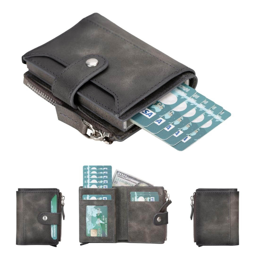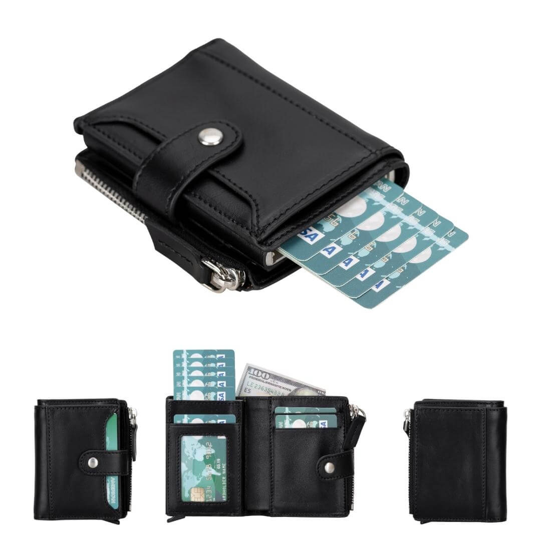 - Special Features: Card holder mechanism, zippered coin slot, buckle clip, transparent ID window